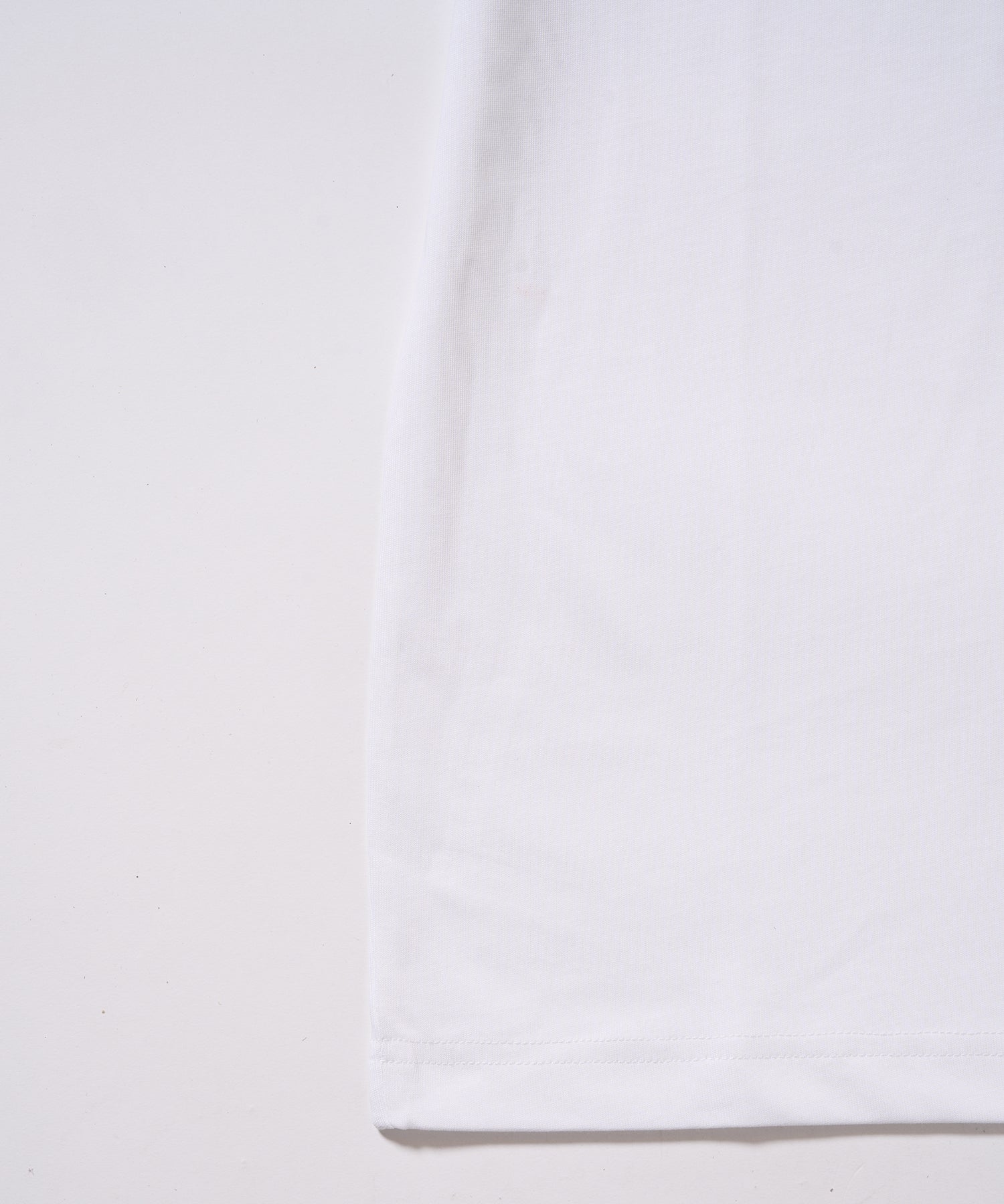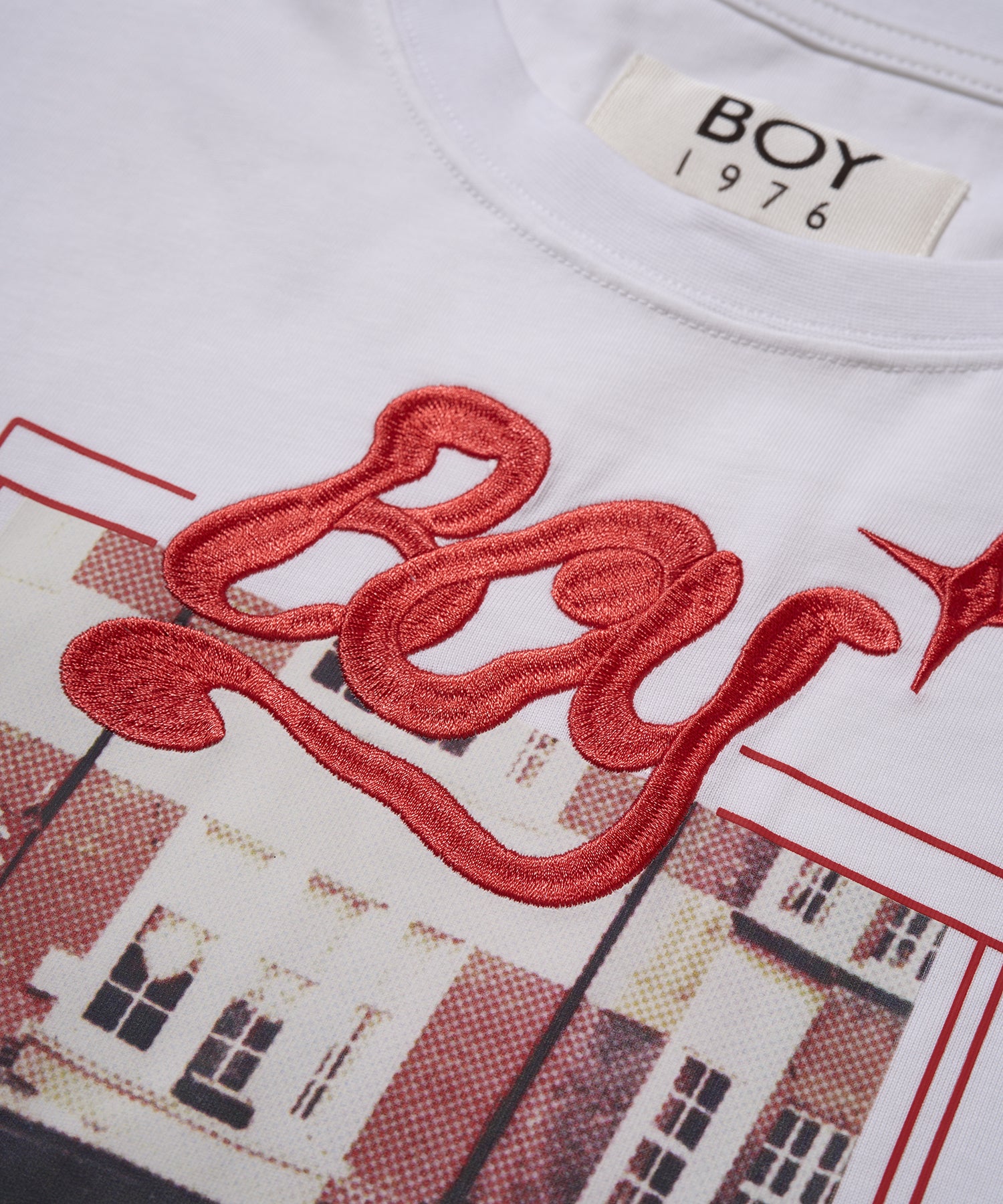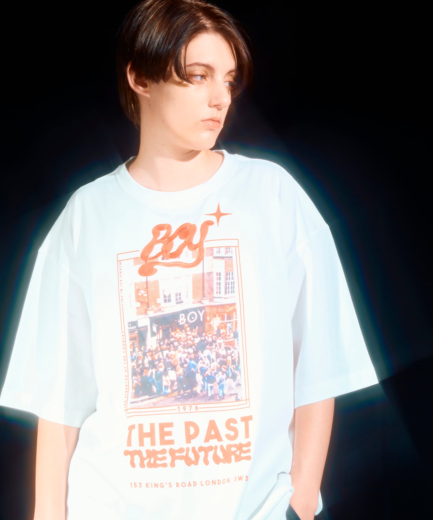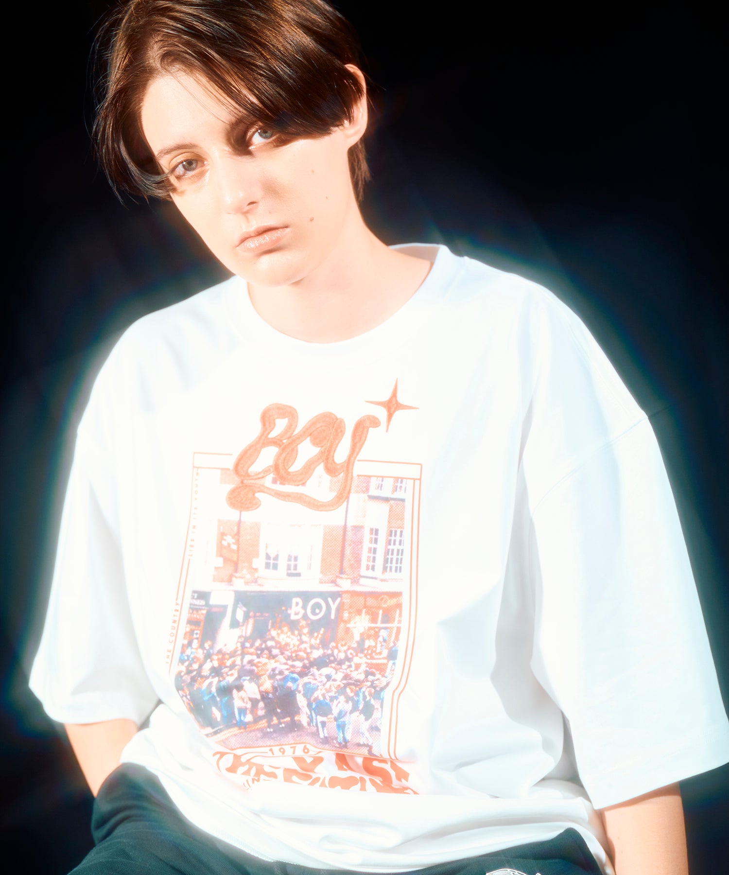 ブランド初の路面店が生まれた 1976年当時の写真を切り取りプリントに落とし込んだ1枚。キングスロードのお店に集まった若者の熱狂・喧騒が伝わってきます。首下にはBOYの刺繍入り。刺繍糸やプリントカラーに使用されたオレンジが映えています。