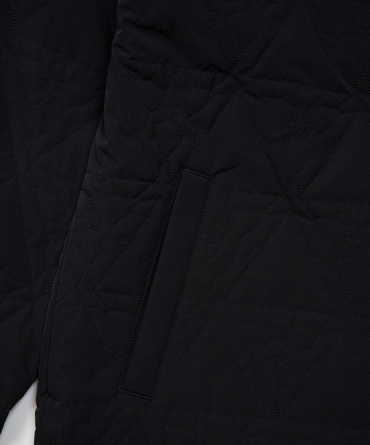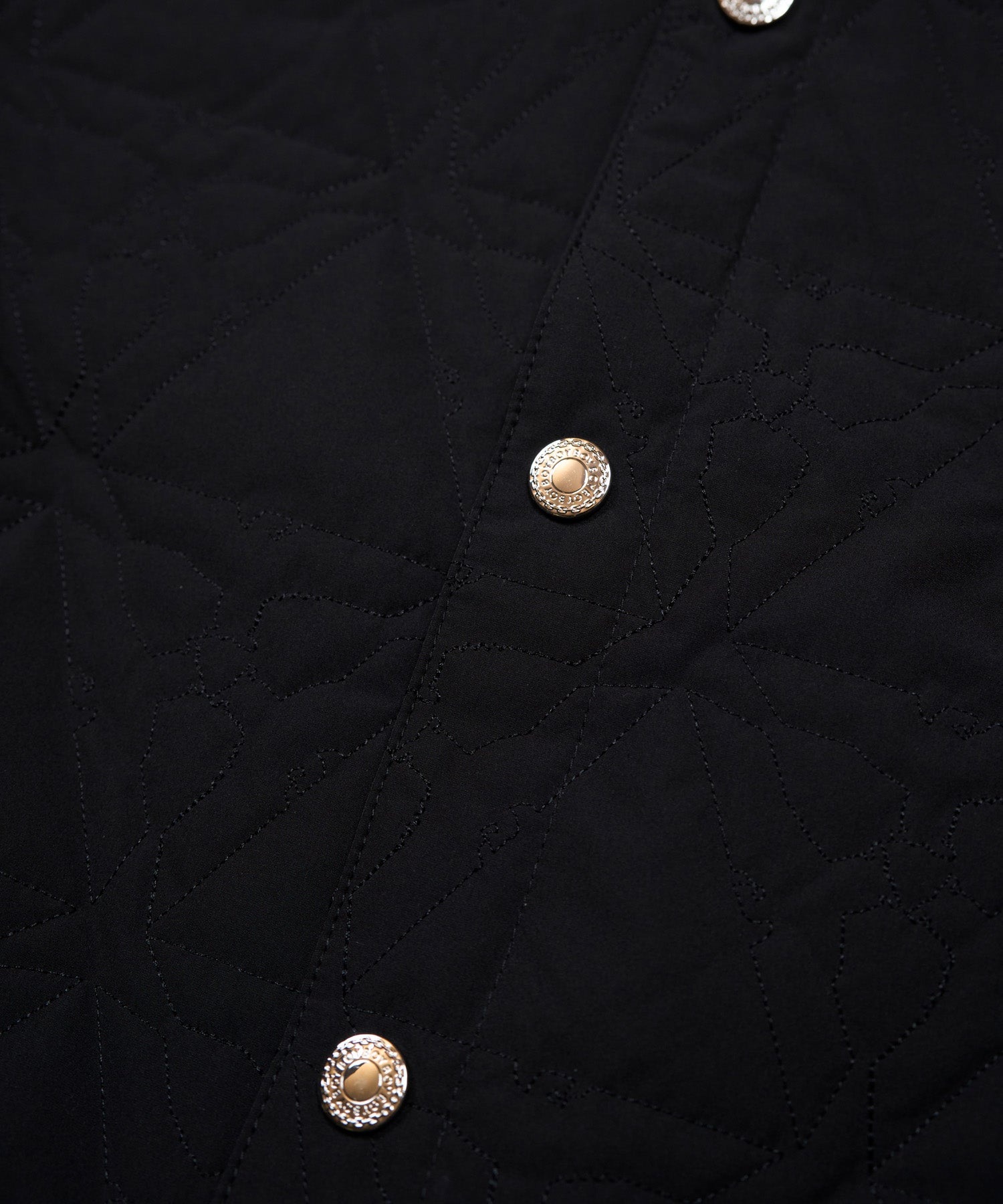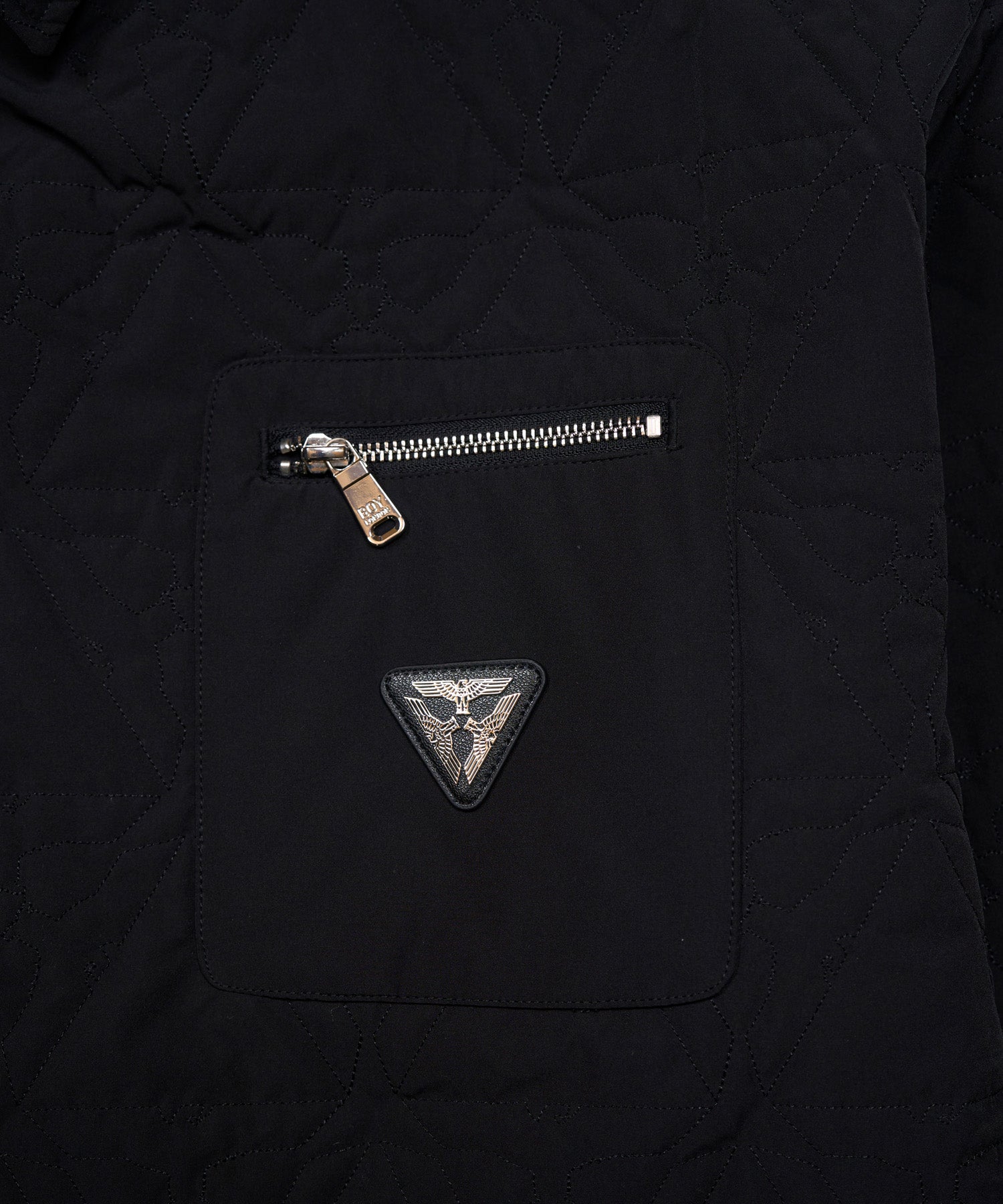 ブランドアイコンのイーグルがキルティングで縁取られたワザありなジャケット。ボタンやファスナーはシルバーカラーでブラックボディとのコントラストを出しています。