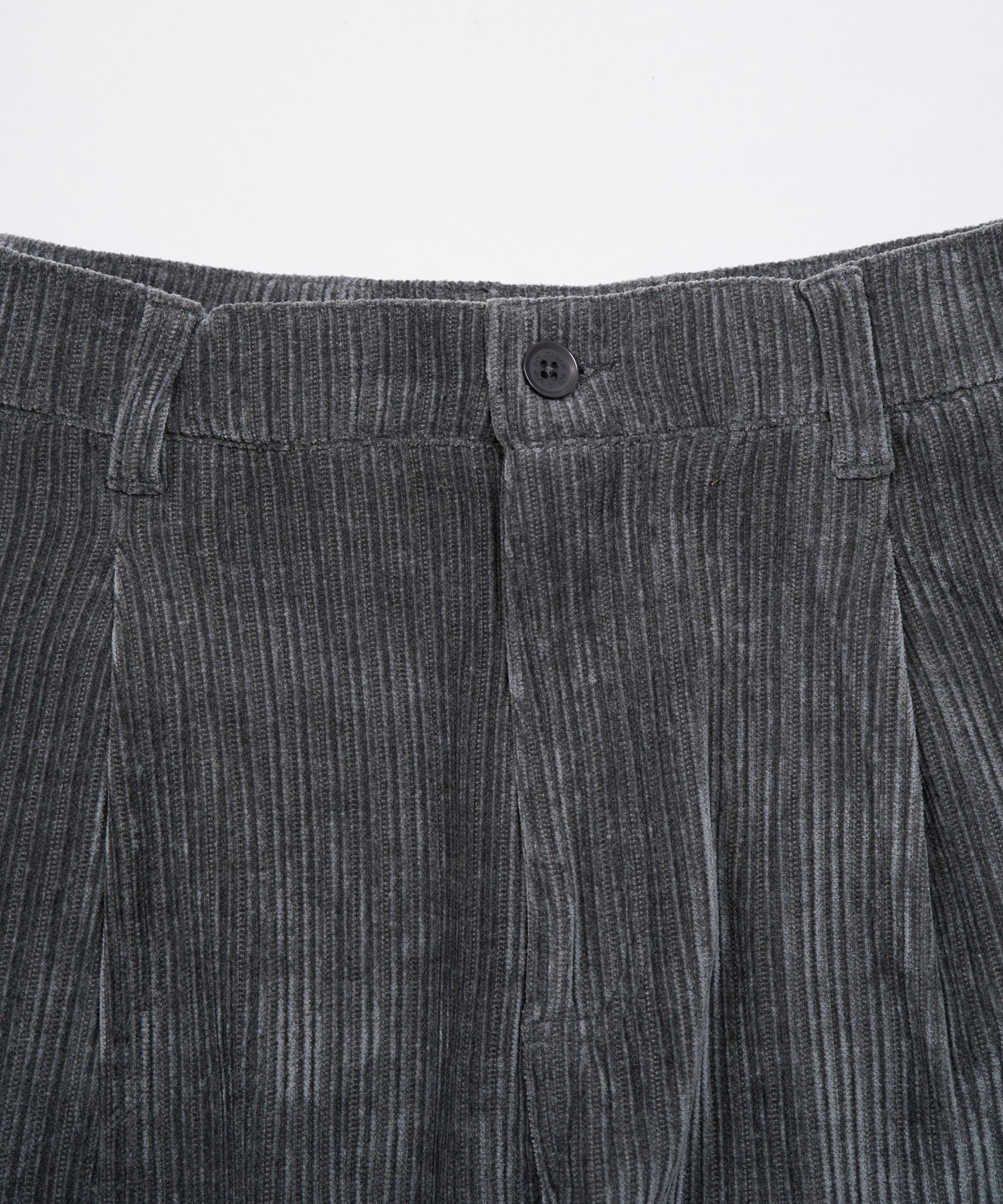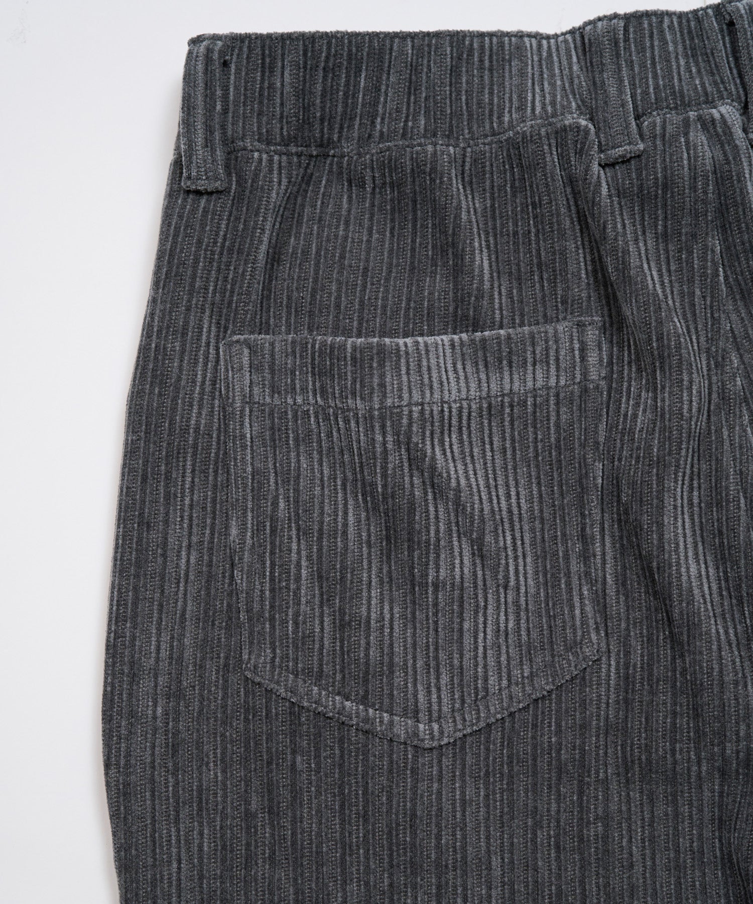 ワンポイント刺繍がなされたコーデュロイパンツ。毛足の長いシルバーグレーのカラーリングが表情豊かです。また伸縮性のある素材でウエストにはゴム入りの為、履き心地も快適です。オリジナル釦仕様。