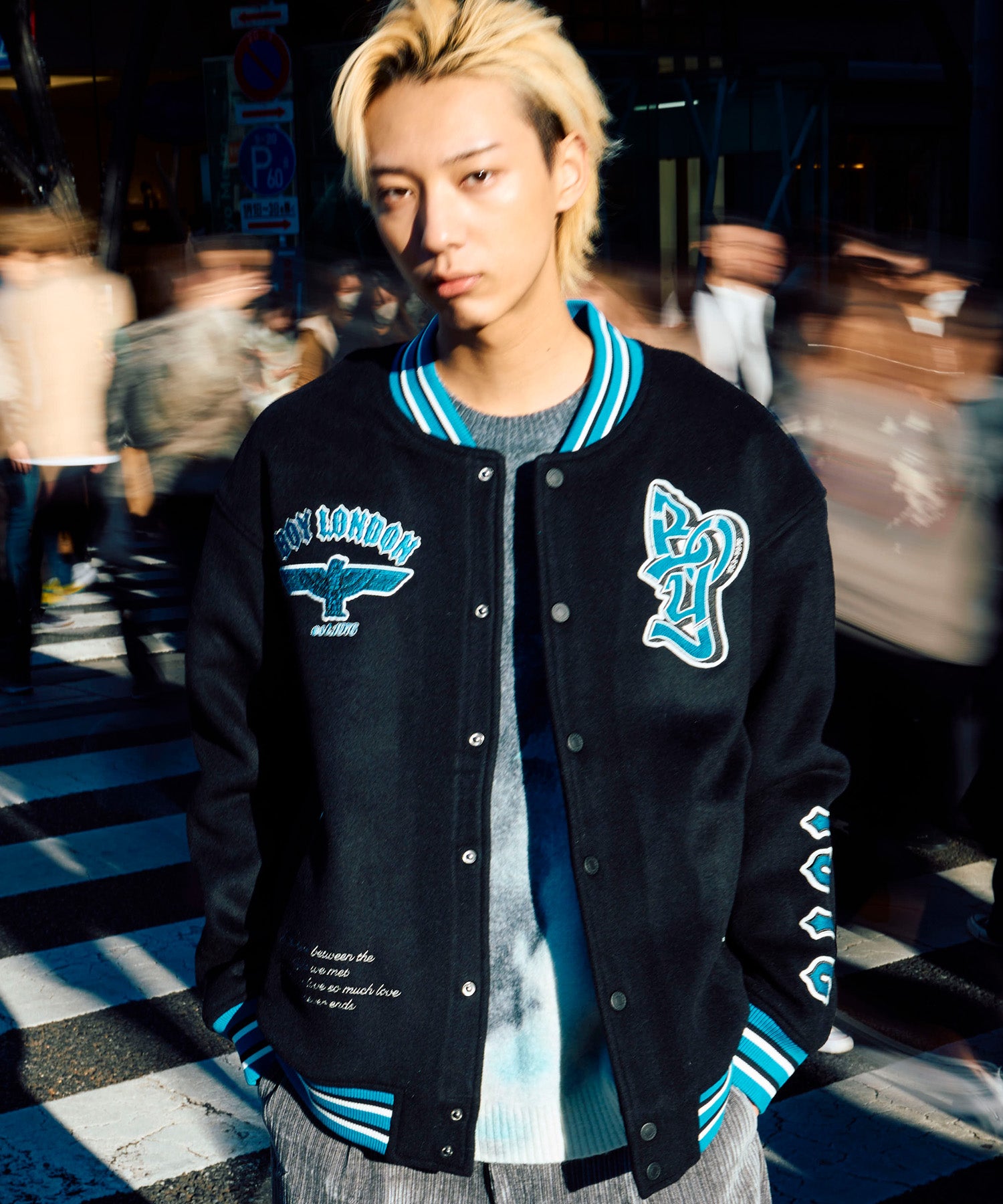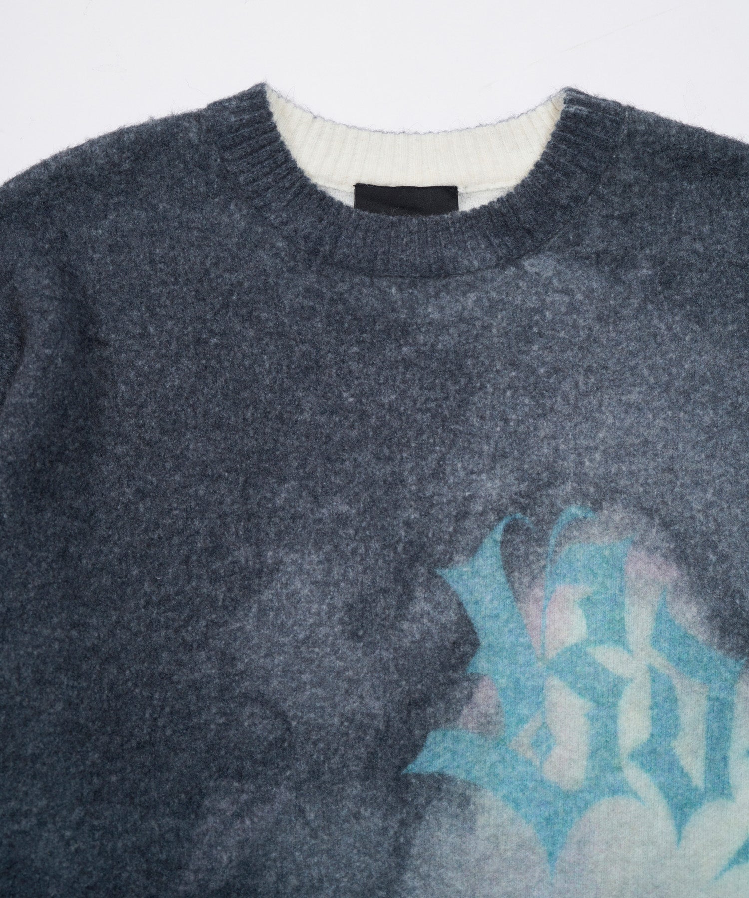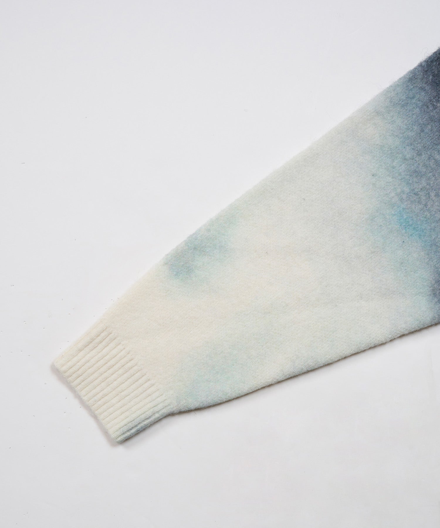モヘア調の起毛感あふれる仕上げのウール混ナイロンニットです。しっかりと詰めて編まれているため重厚感もあります。フロントにはBOY、背面にはLONDONの文字を組み込み、淡いブルーを効かせたプリントでグラデーションデザインに仕上げました。背面首元にオリジナルパッチ付き。