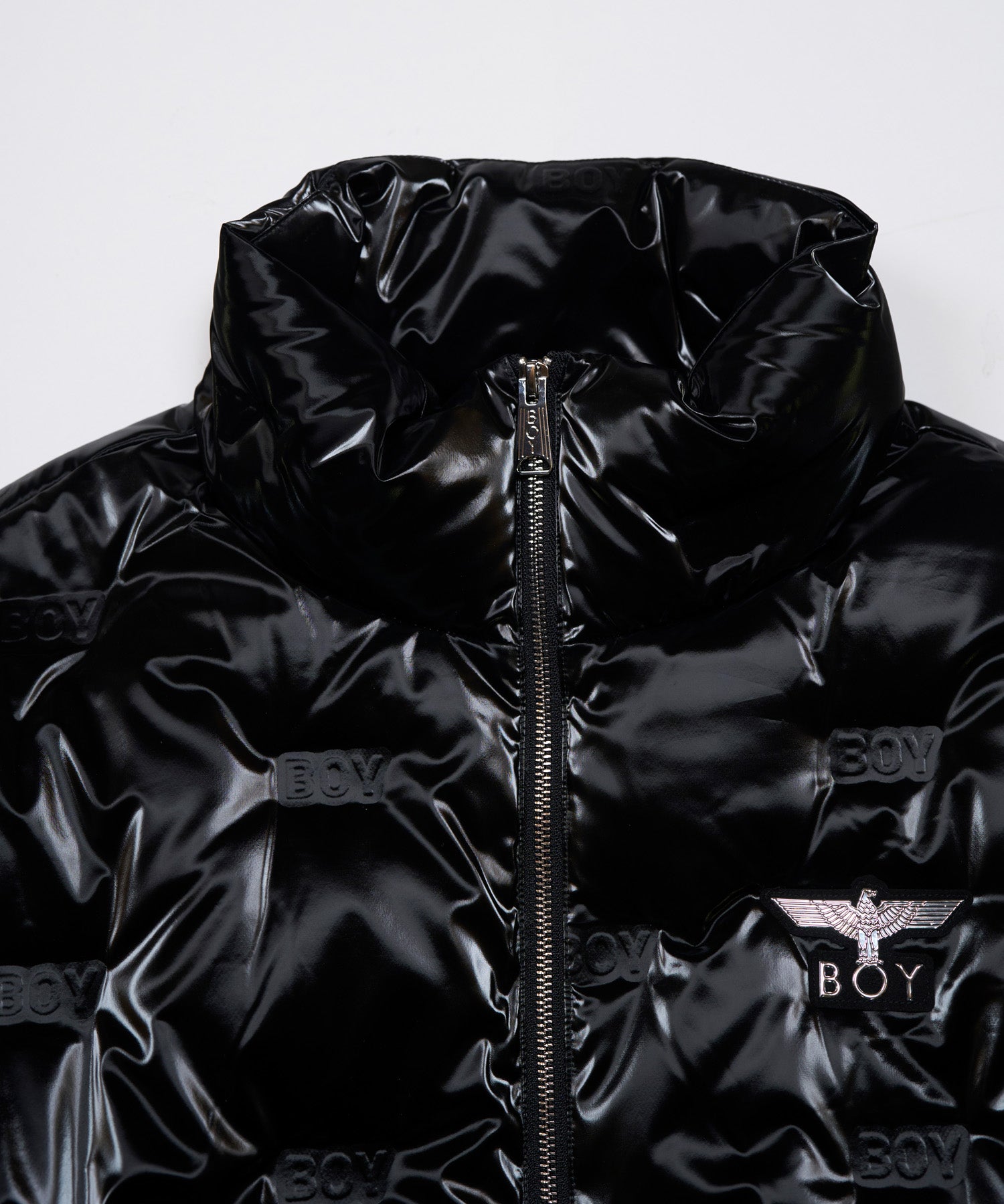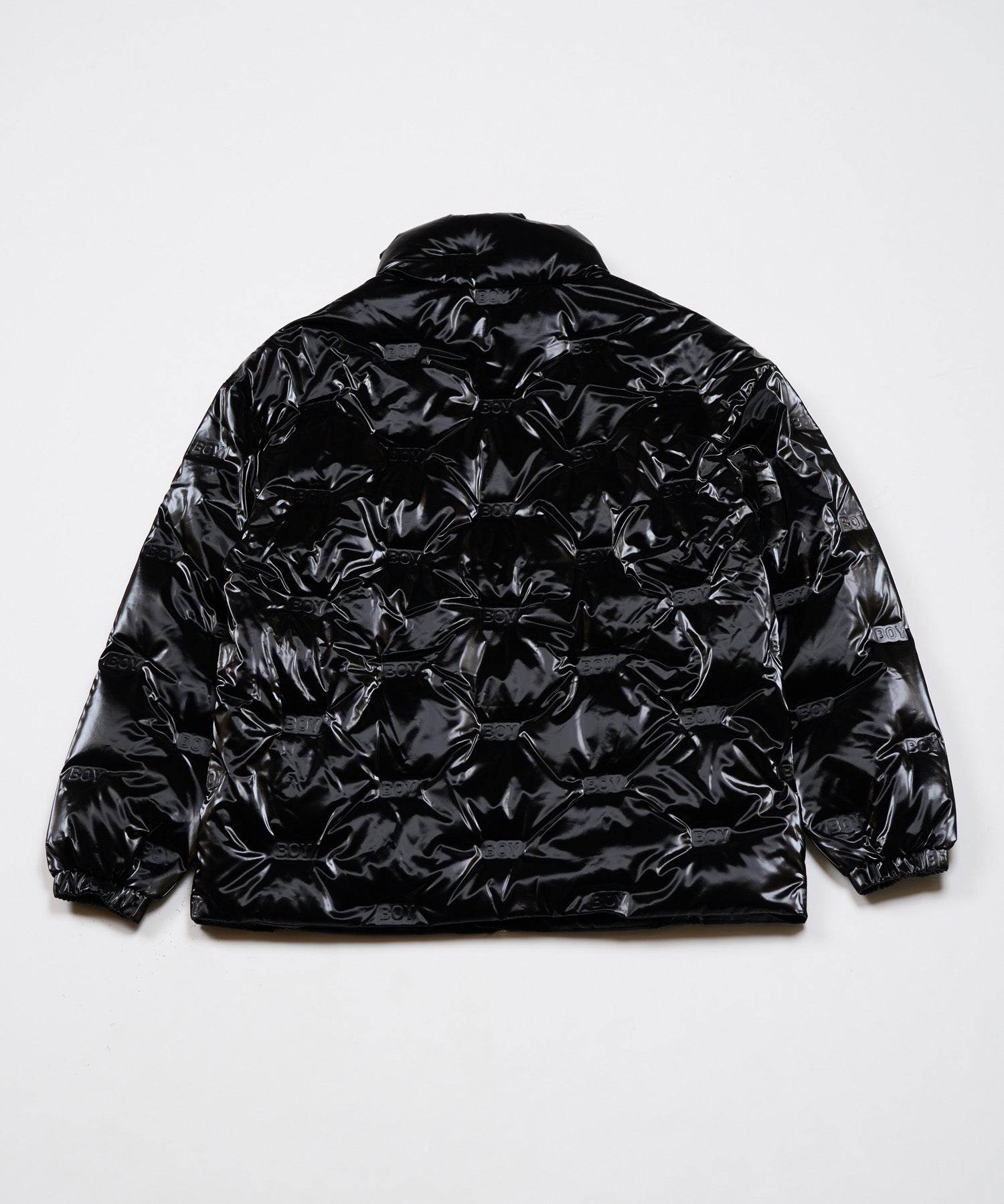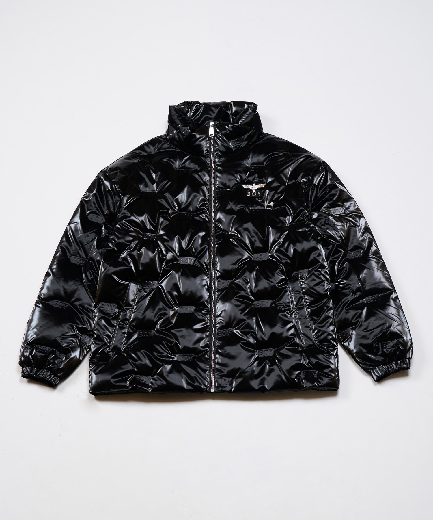 鏡面のようにラミネート加工された光沢あるポリエステル素材にBOYロゴをエンボス加工で散りばめたダウンブルゾン。胸元にシルバーカラーのロゴパッチ付き。裏地もオリジナルのモノトーン系総柄プリント生地を使用しています。防水・撥水性にも優れた特徴があります。