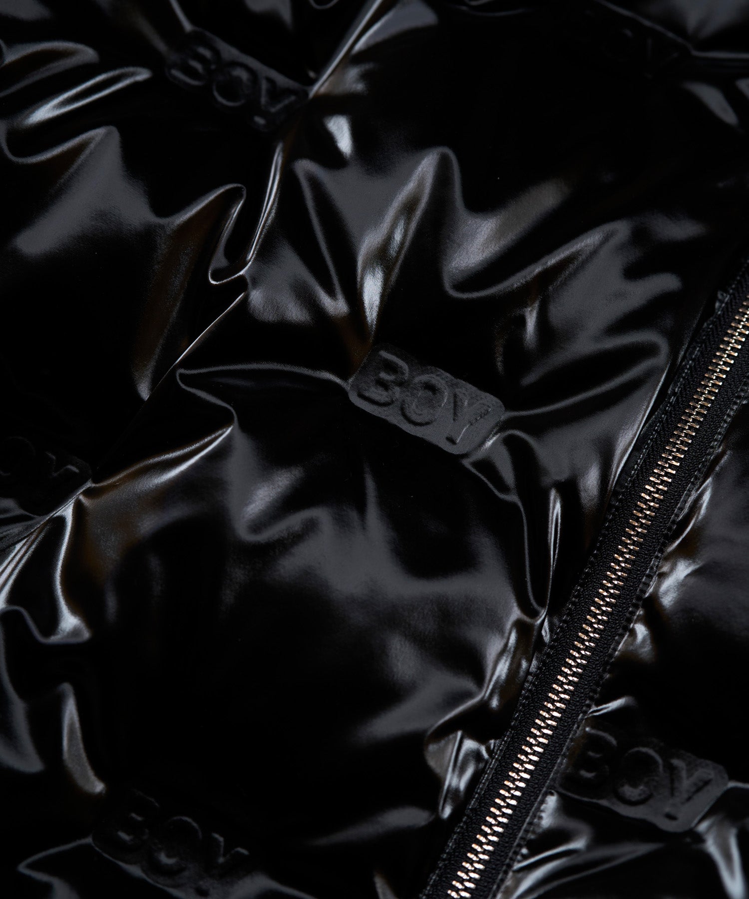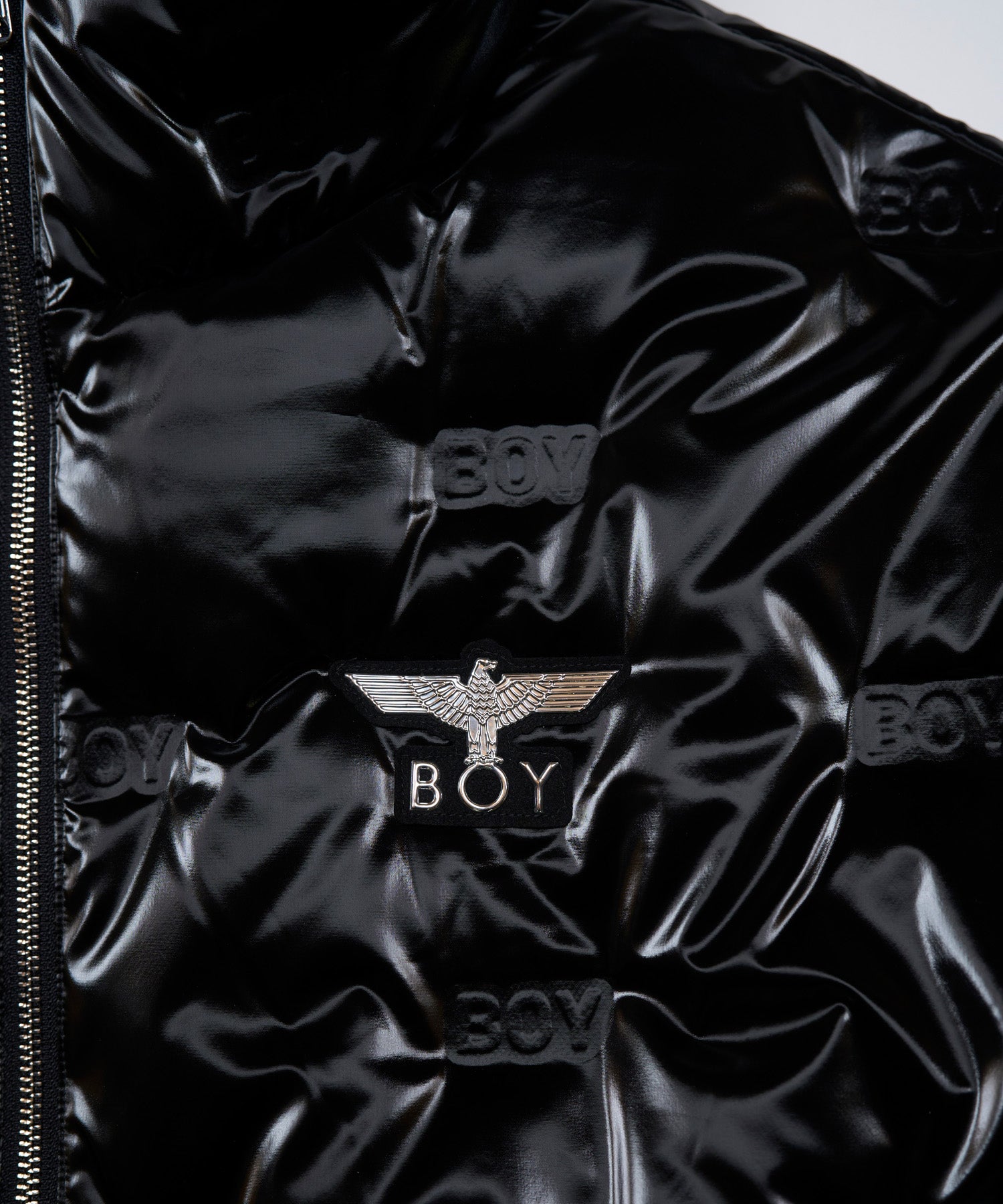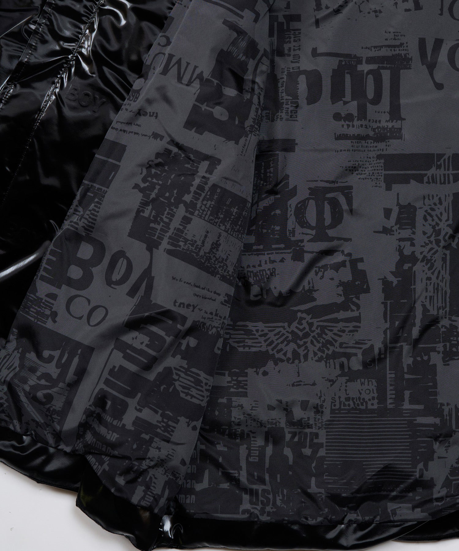 鏡面のようにラミネート加工された光沢あるポリエステル素材にBOYロゴをエンボス加工で散りばめたダウンブルゾン。胸元にシルバーカラーのロゴパッチ付き。裏地もオリジナルのモノトーン系総柄プリント生地を使用しています。防水・撥水性にも優れた特徴があります。