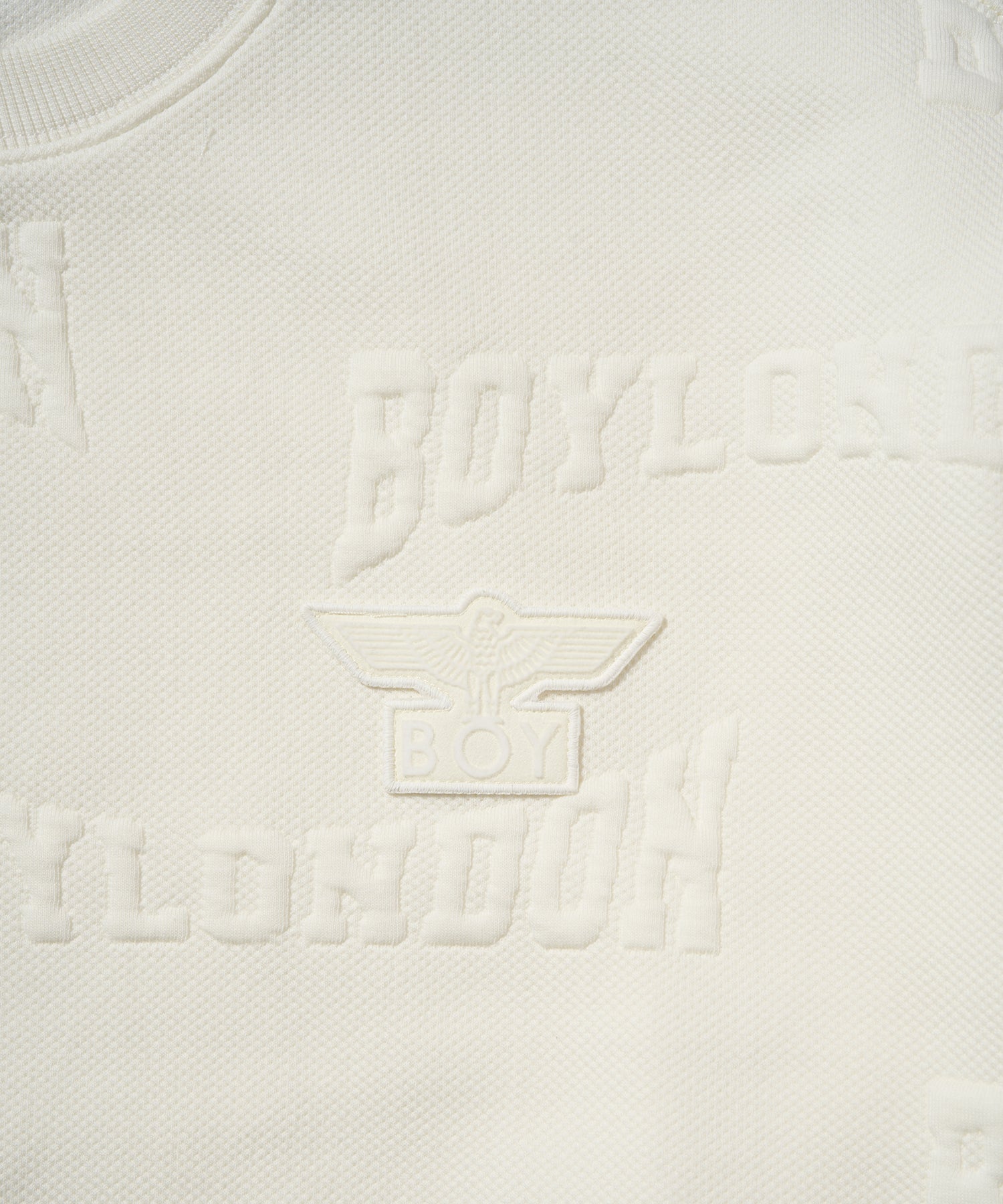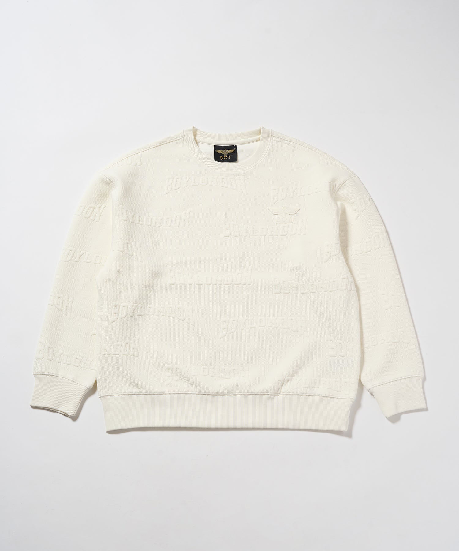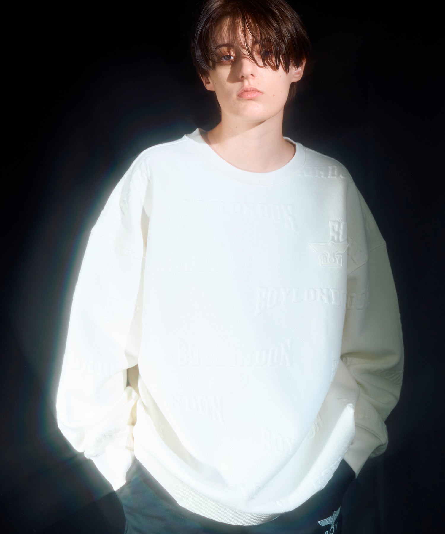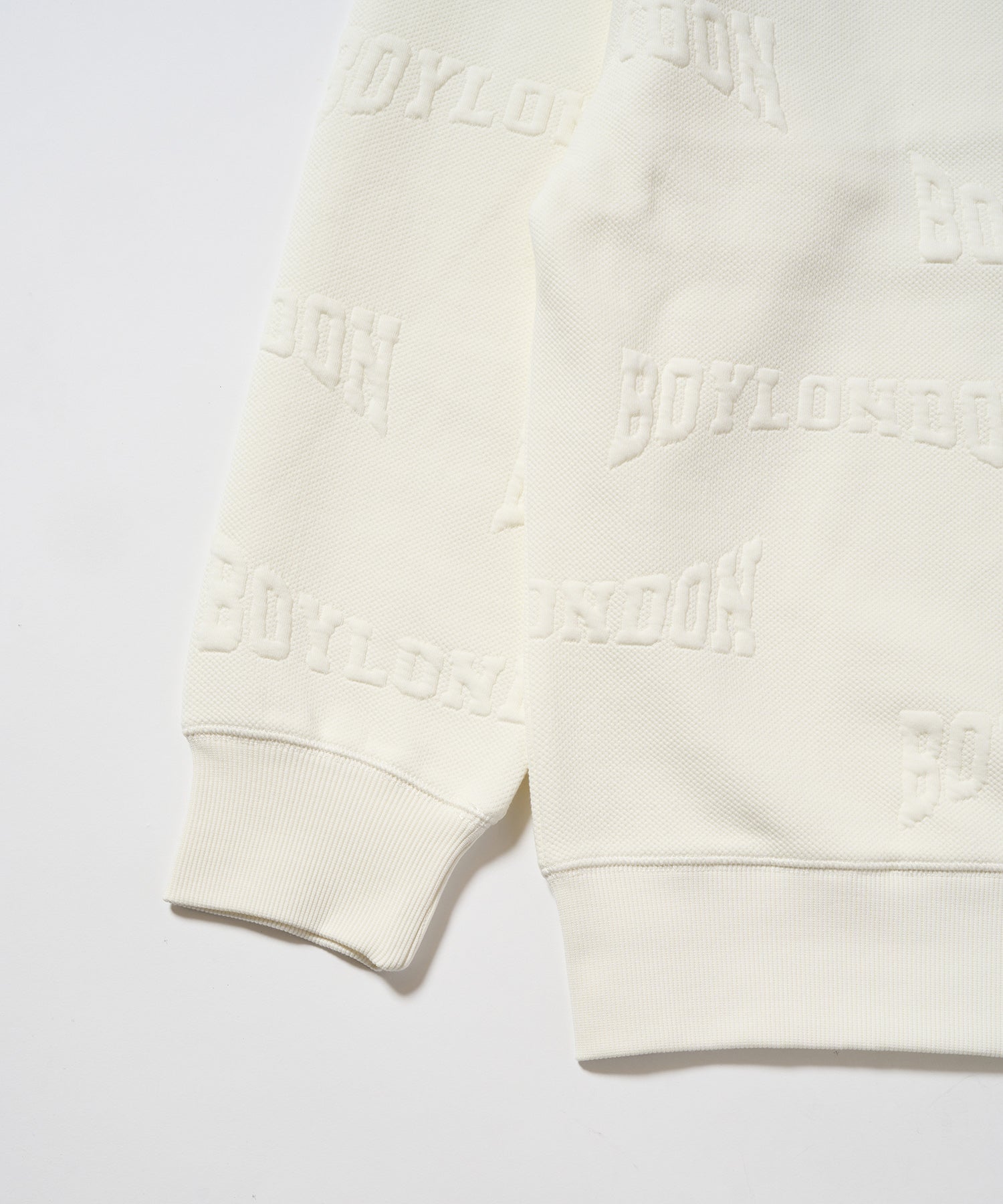 全面に生地同色のBOYLONDONロゴが散りばめられたジャガードニットプルオーバー。ゆとりあるオーバーサイズシルエット。丈夫なポリエステル混の生地ですのでタフで快適な着心地です。