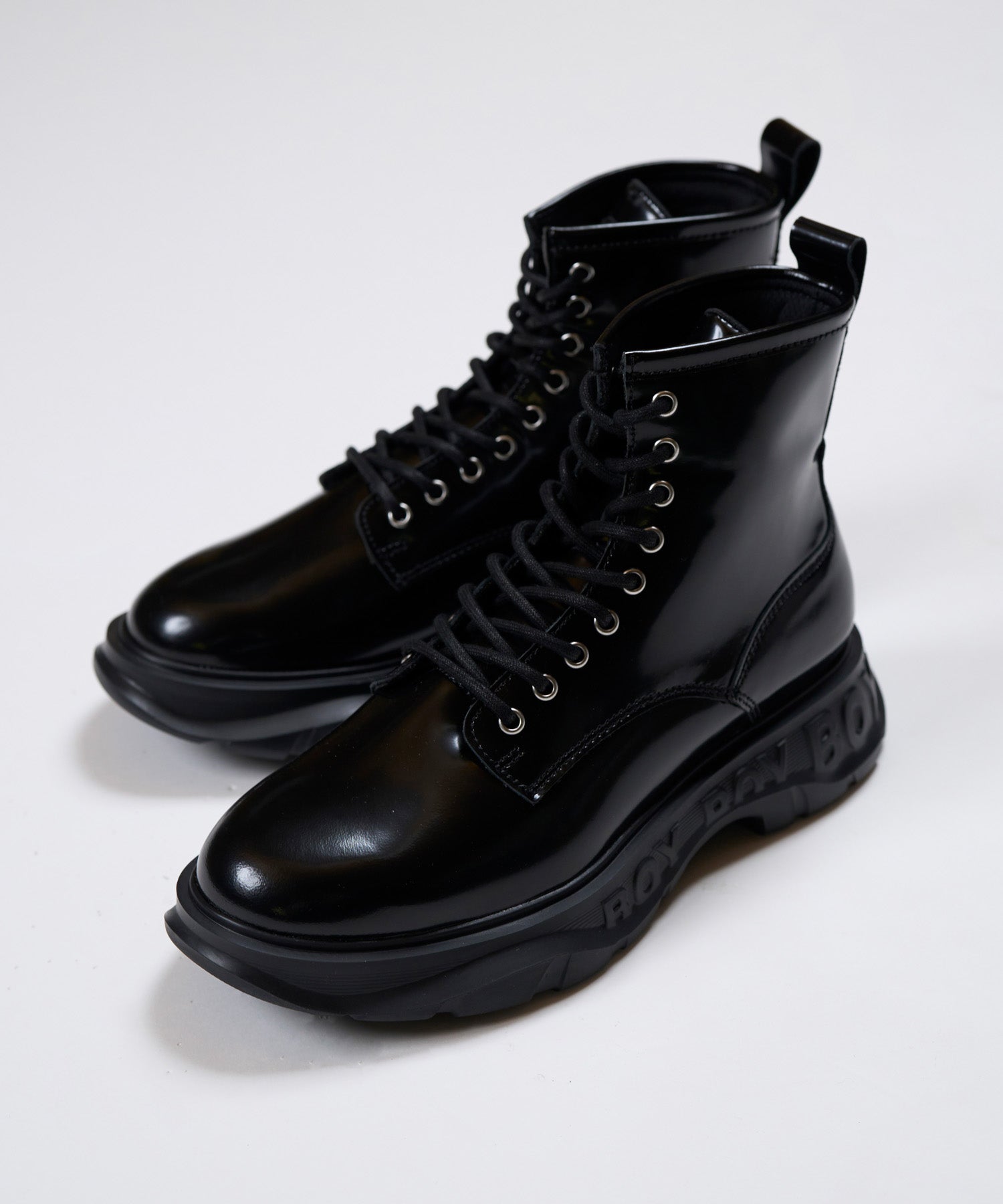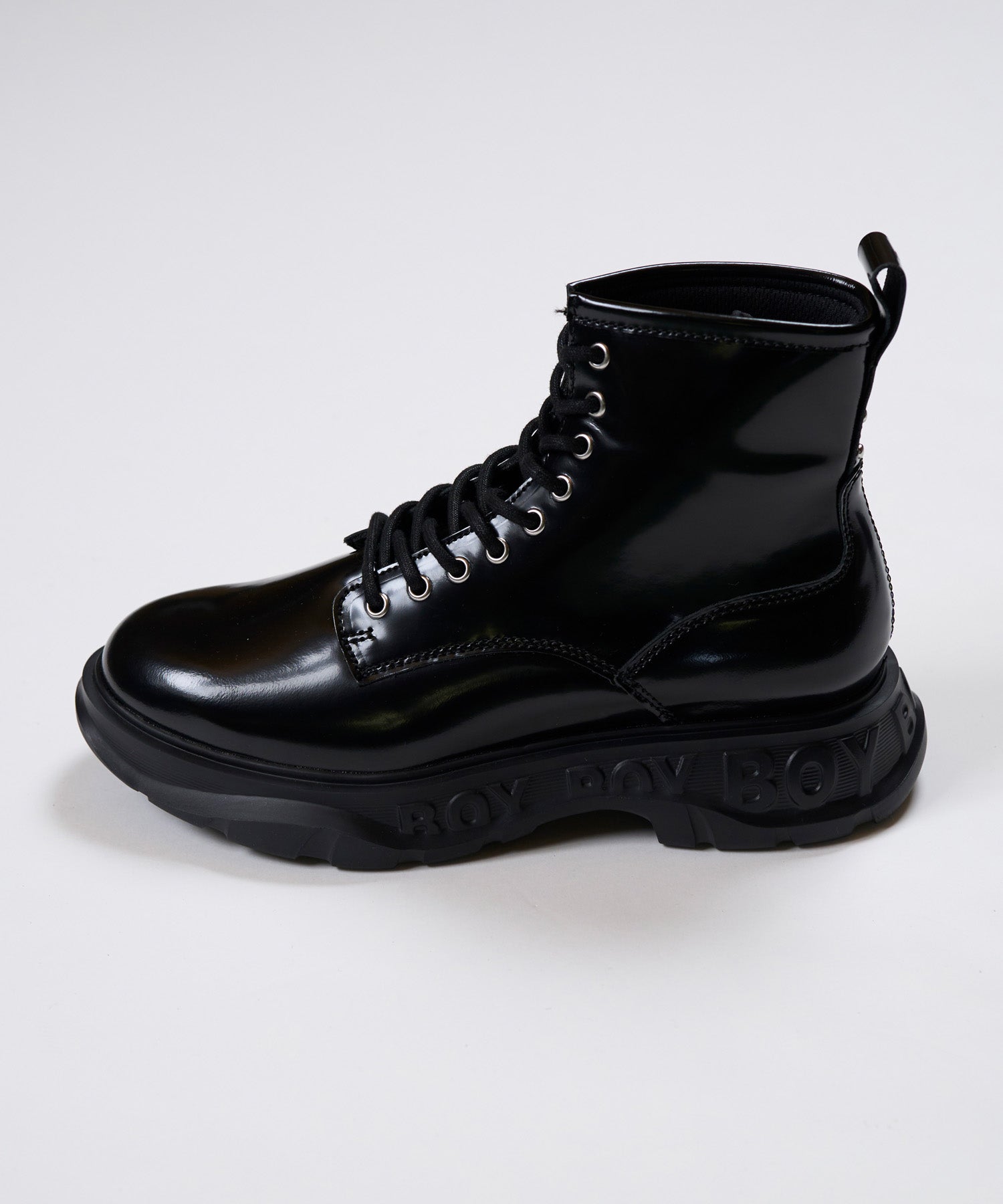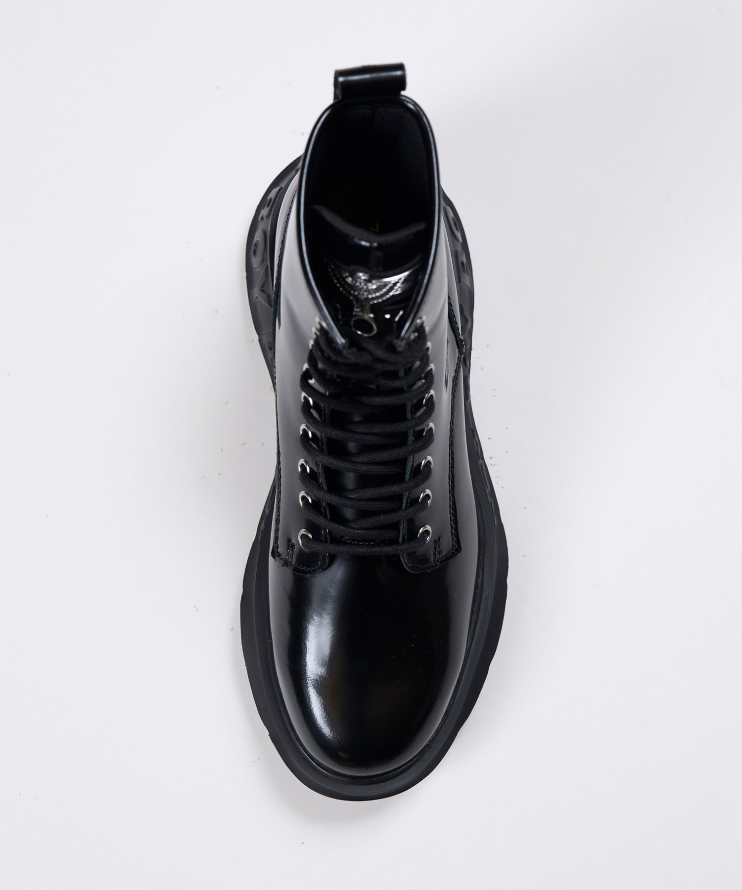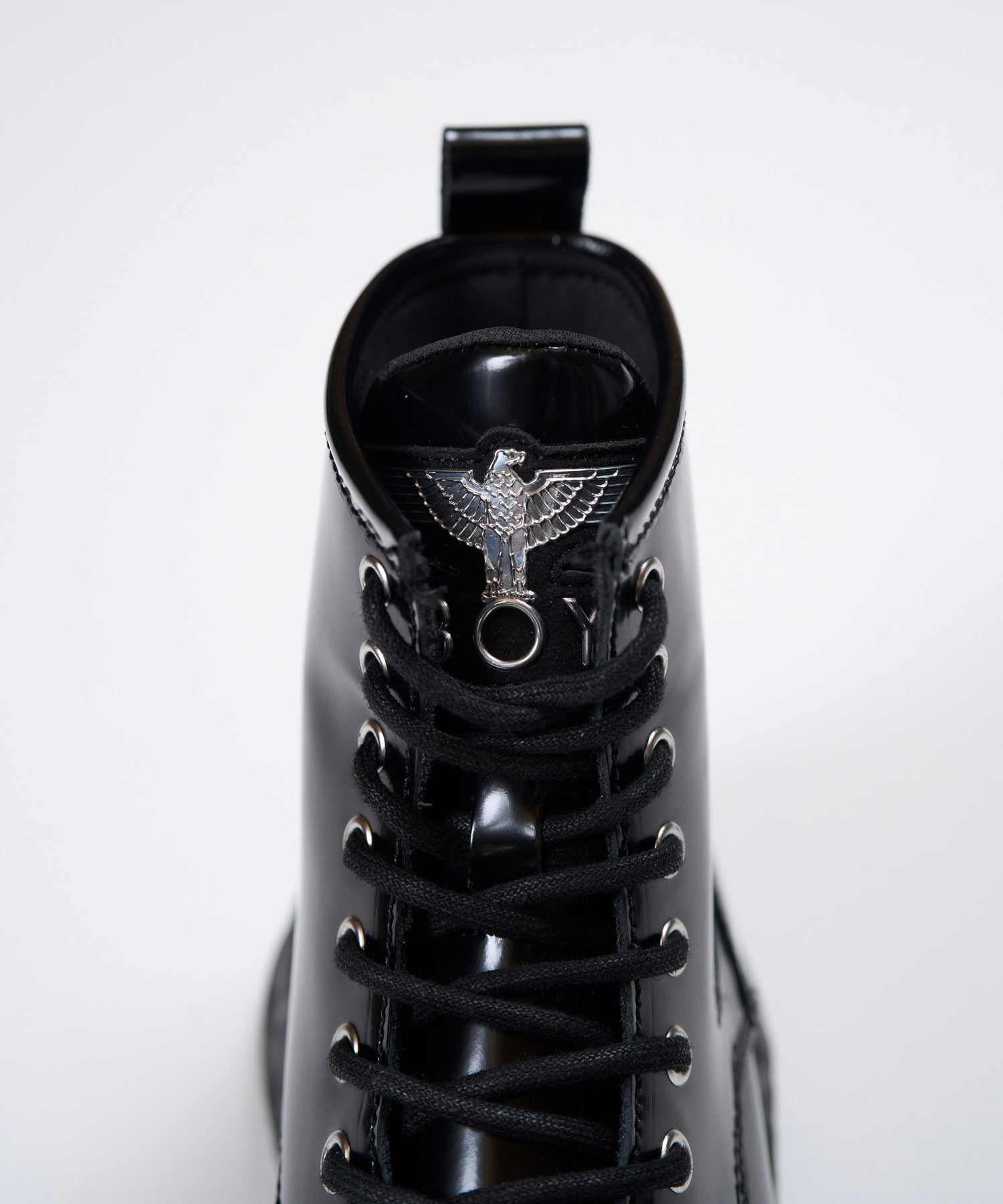光沢あるエナメル素材を使用した9ホールのシューズ。オリジナルソールがとにかく軽く、快適な履き心地です。アイレット部分と合わせてタン部分にシルバーカラーのアイコンパッチ付き。