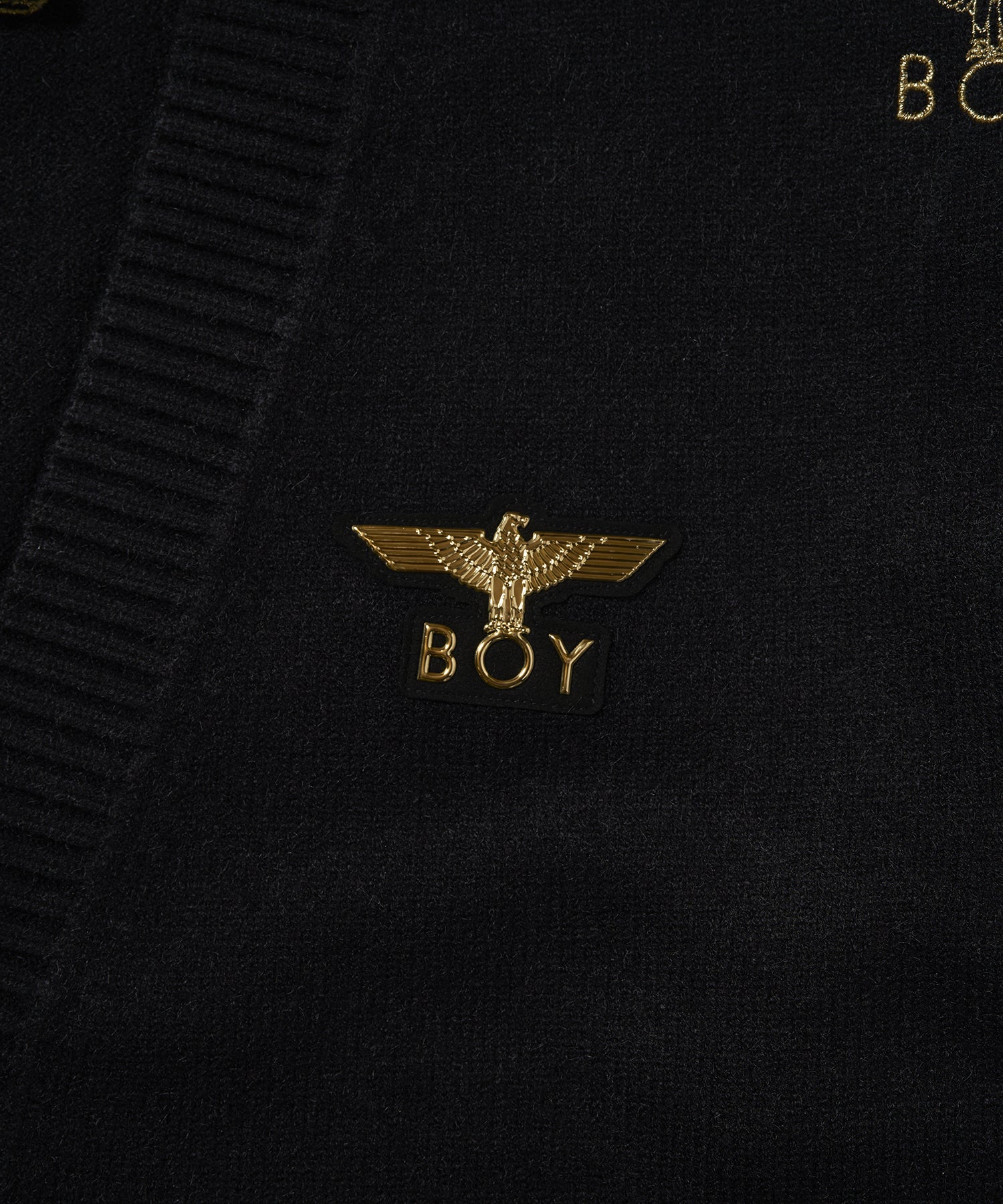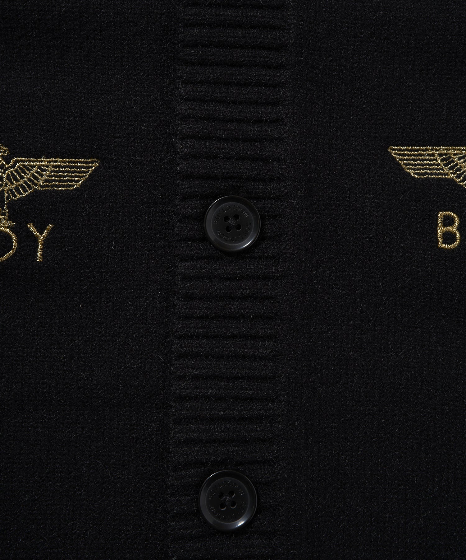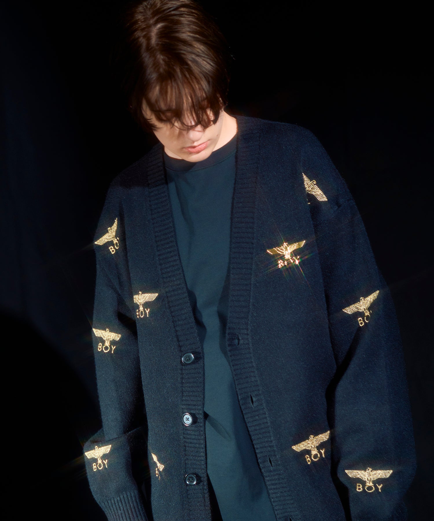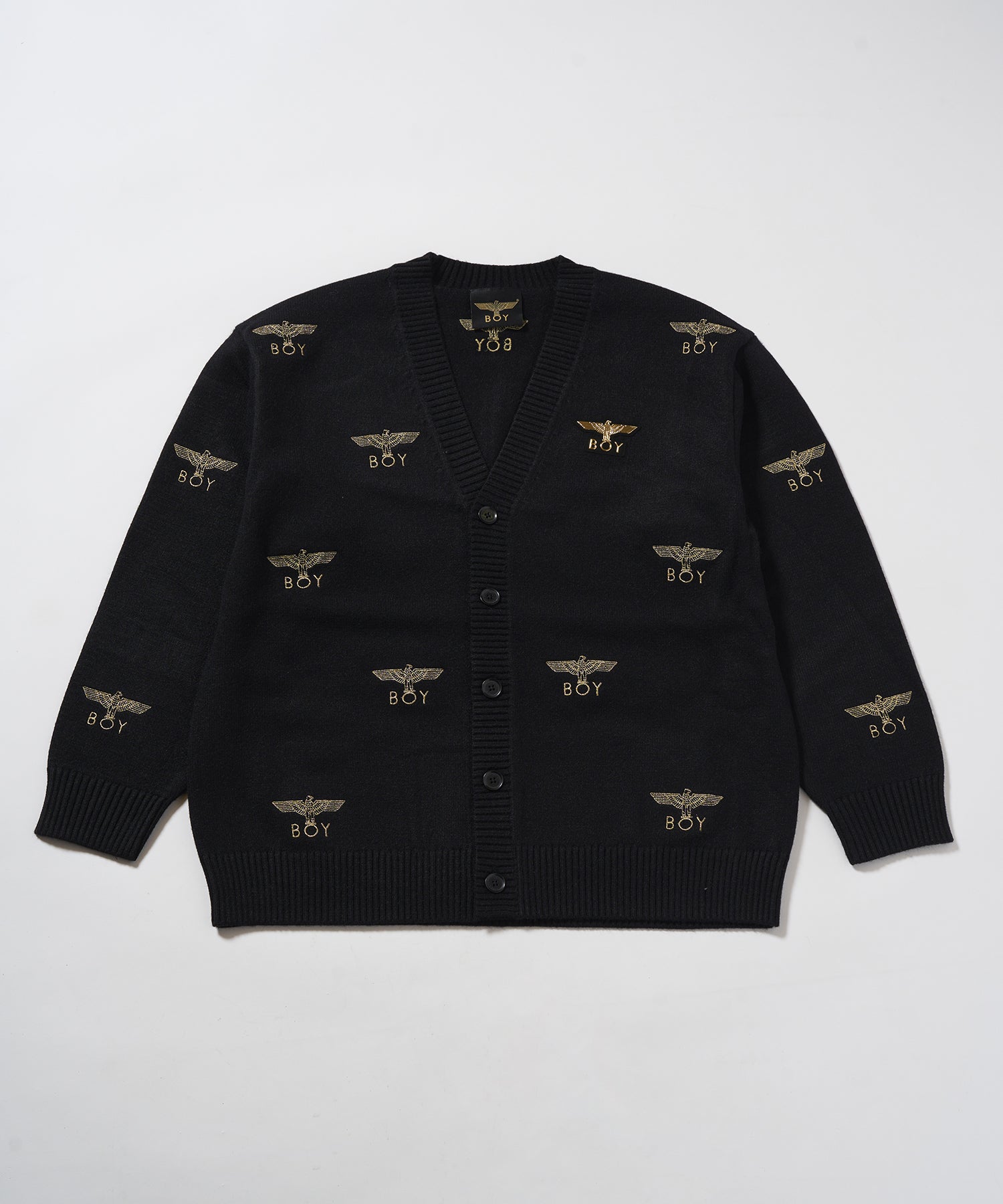 全面にゴールドカラーのBOY & EAGLEロゴが散りばめられた、オーバーサイズのカーディガン。黒にゴールド刺繍が映えます。左胸部分1箇所のみラバープリントされたワッペンが縫い付けられています。