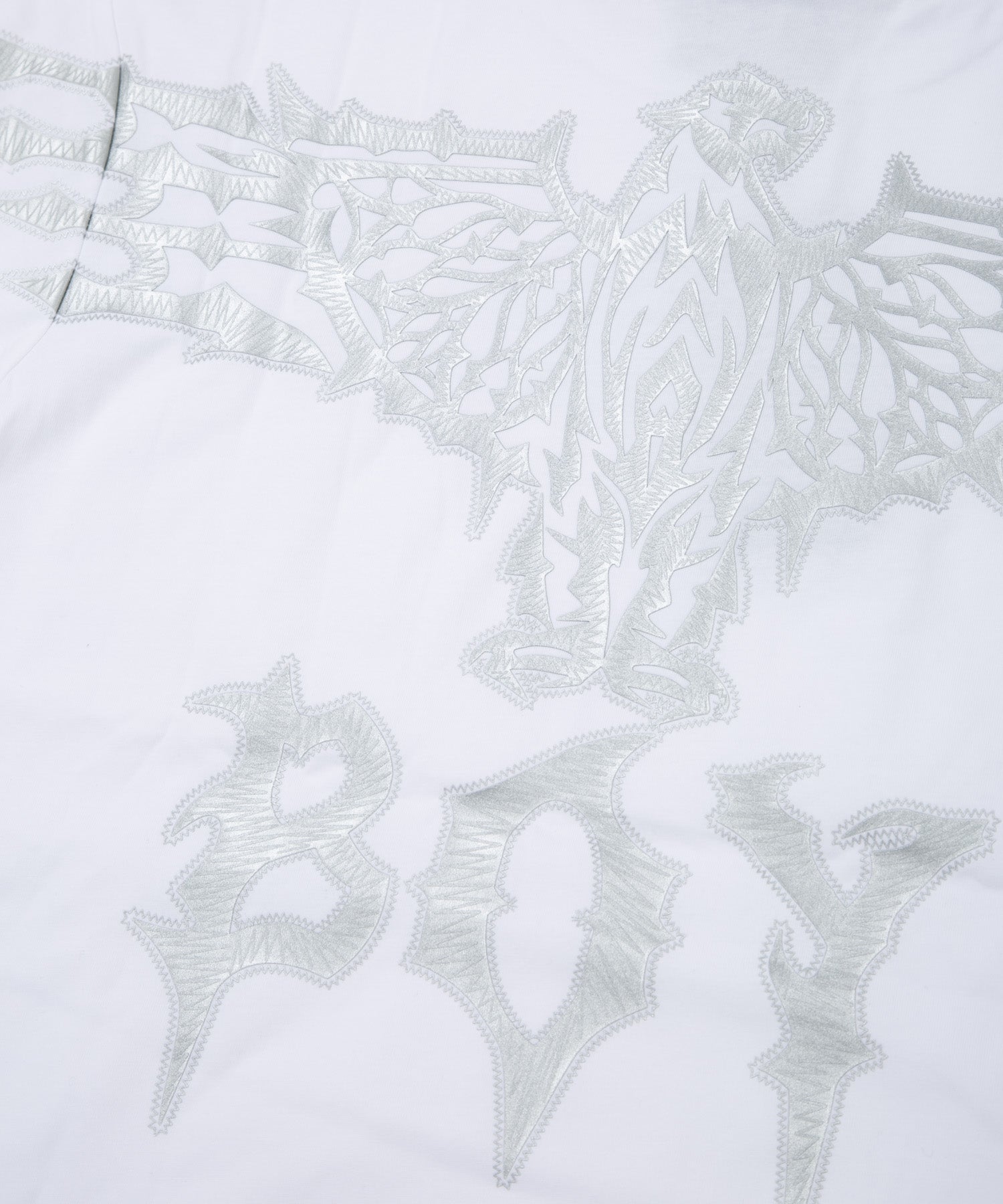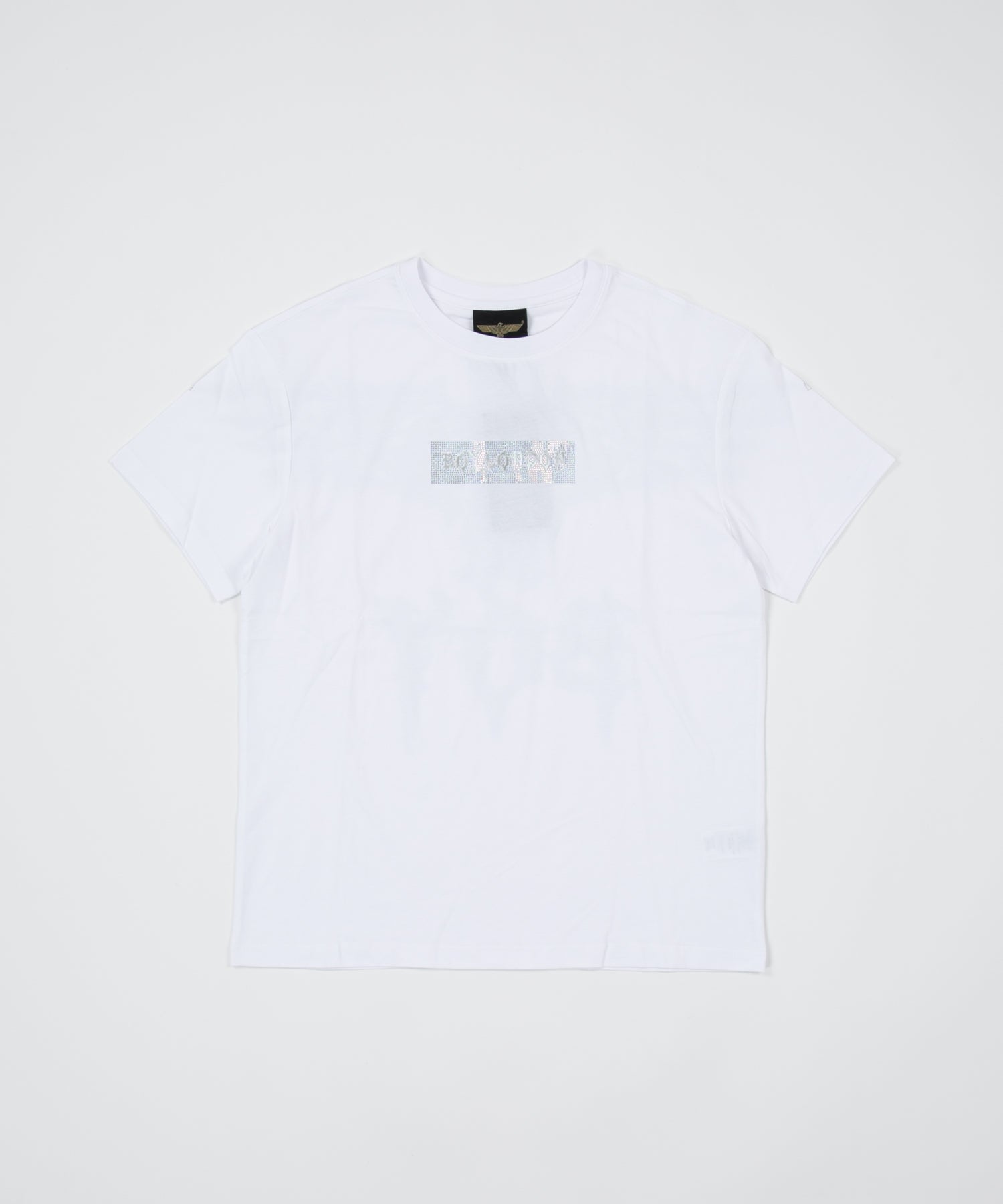 胸元のロゴ周りにラインストーン、バックにギザギザと切り刻んだようなイーグルのプリントを施したTシャツです。
