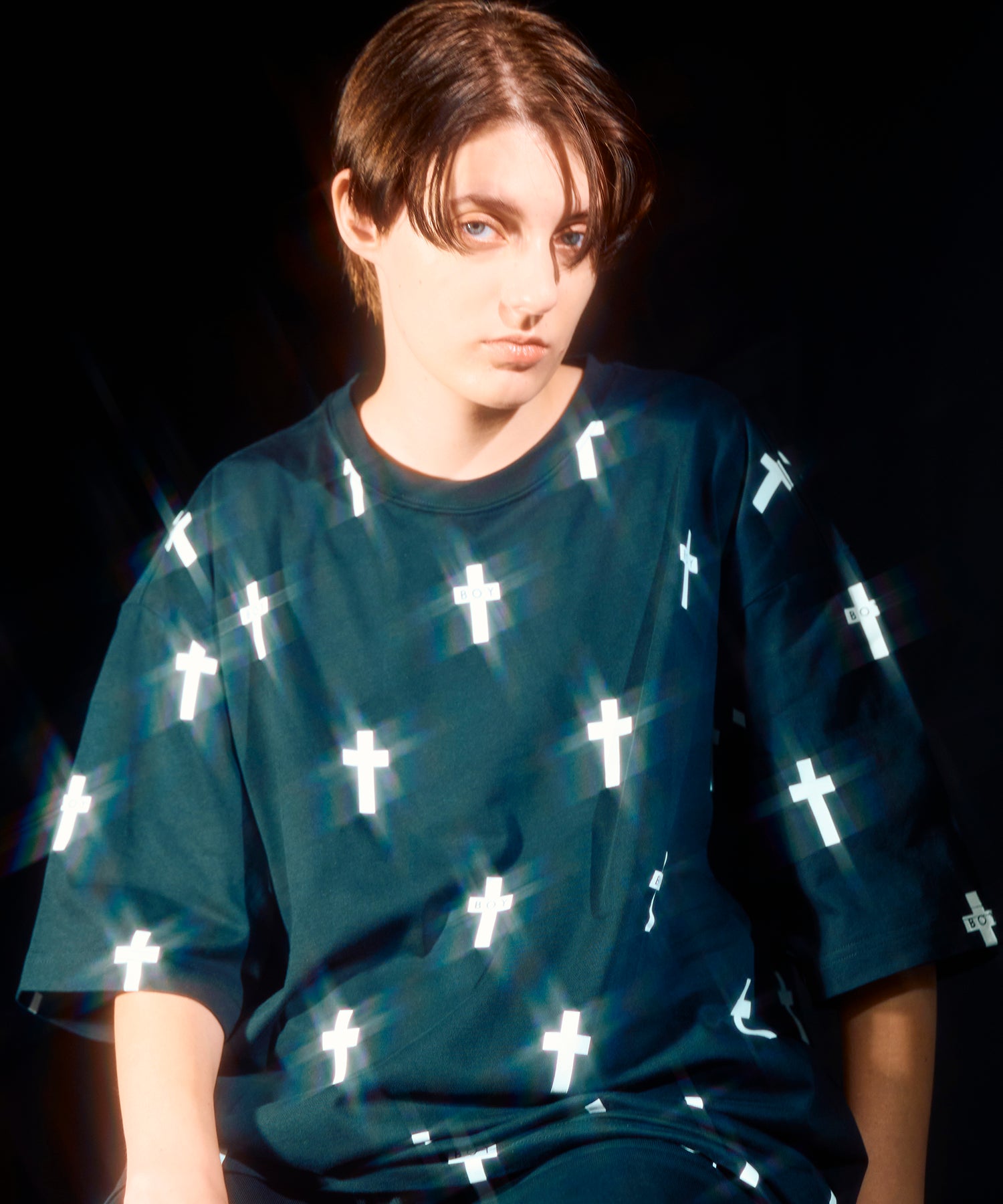 規則性を持って配置されたクロスプリント生地を使用した総柄TEE。1枚でもさりげなくジャケットなどのインナーとしても活用しやすいアイテムです。