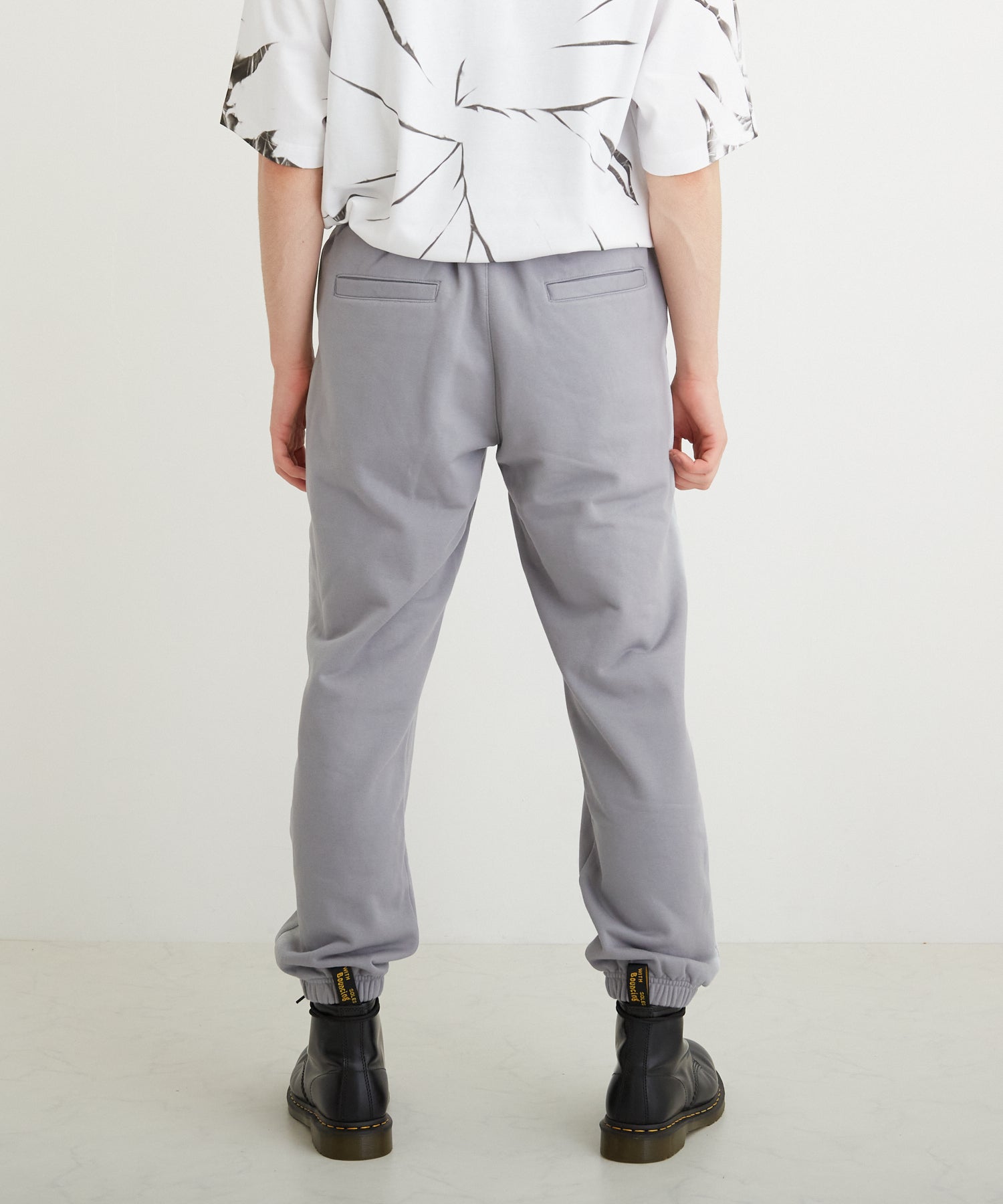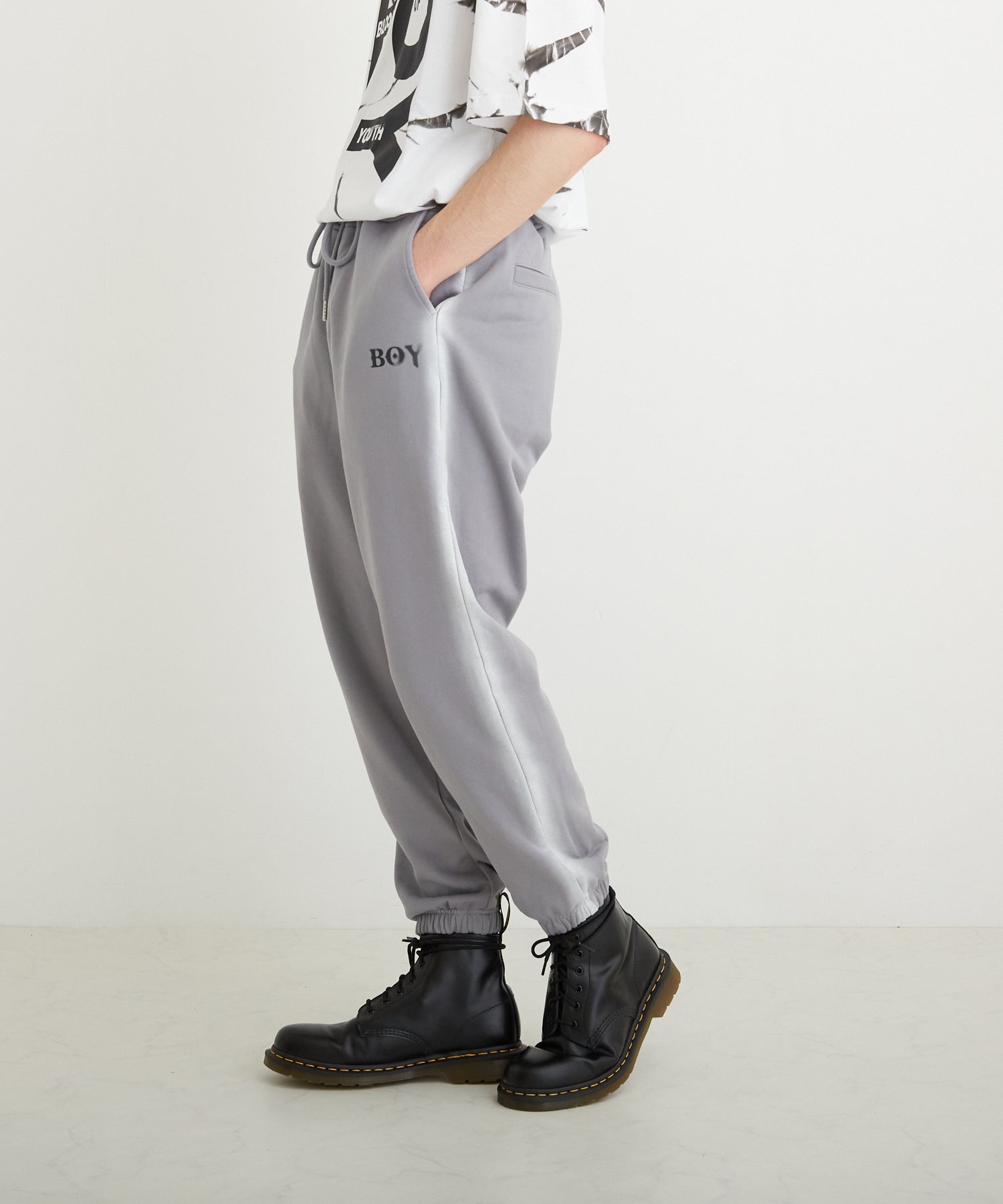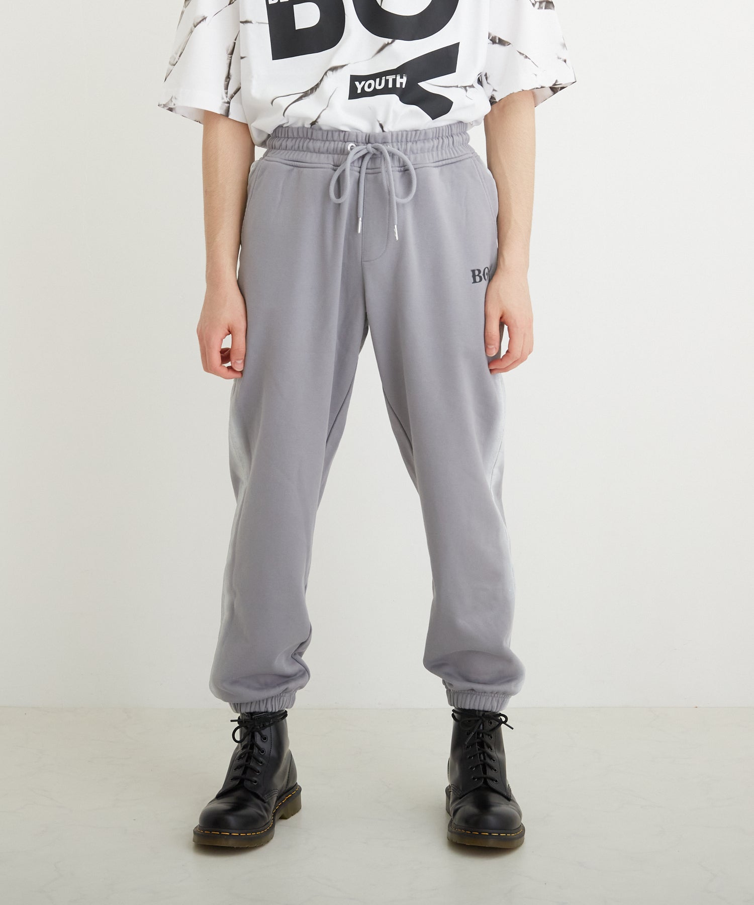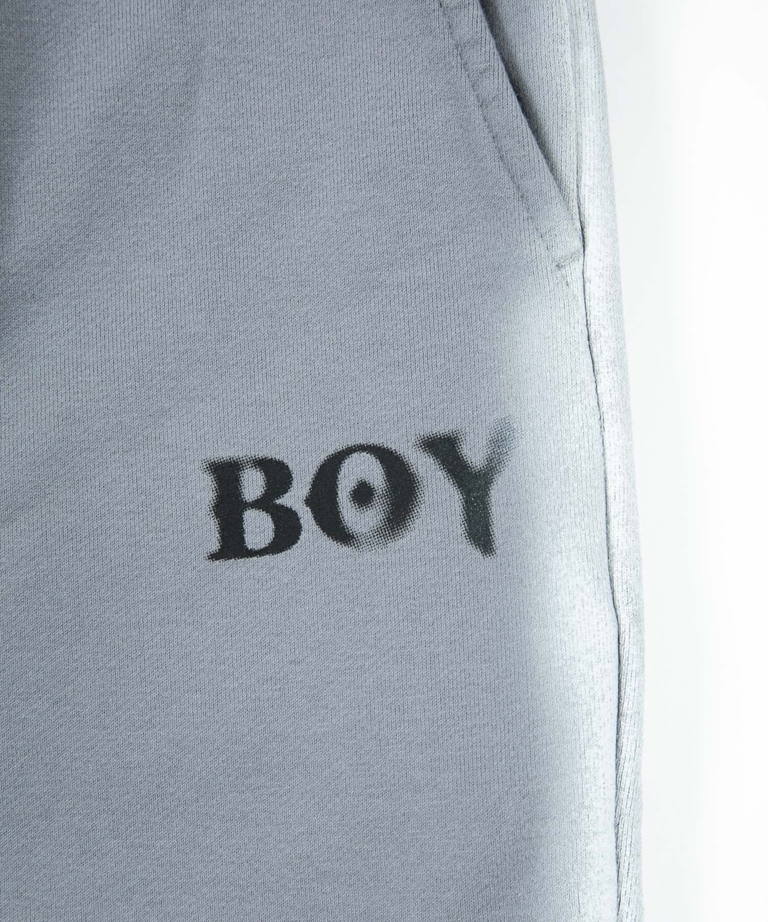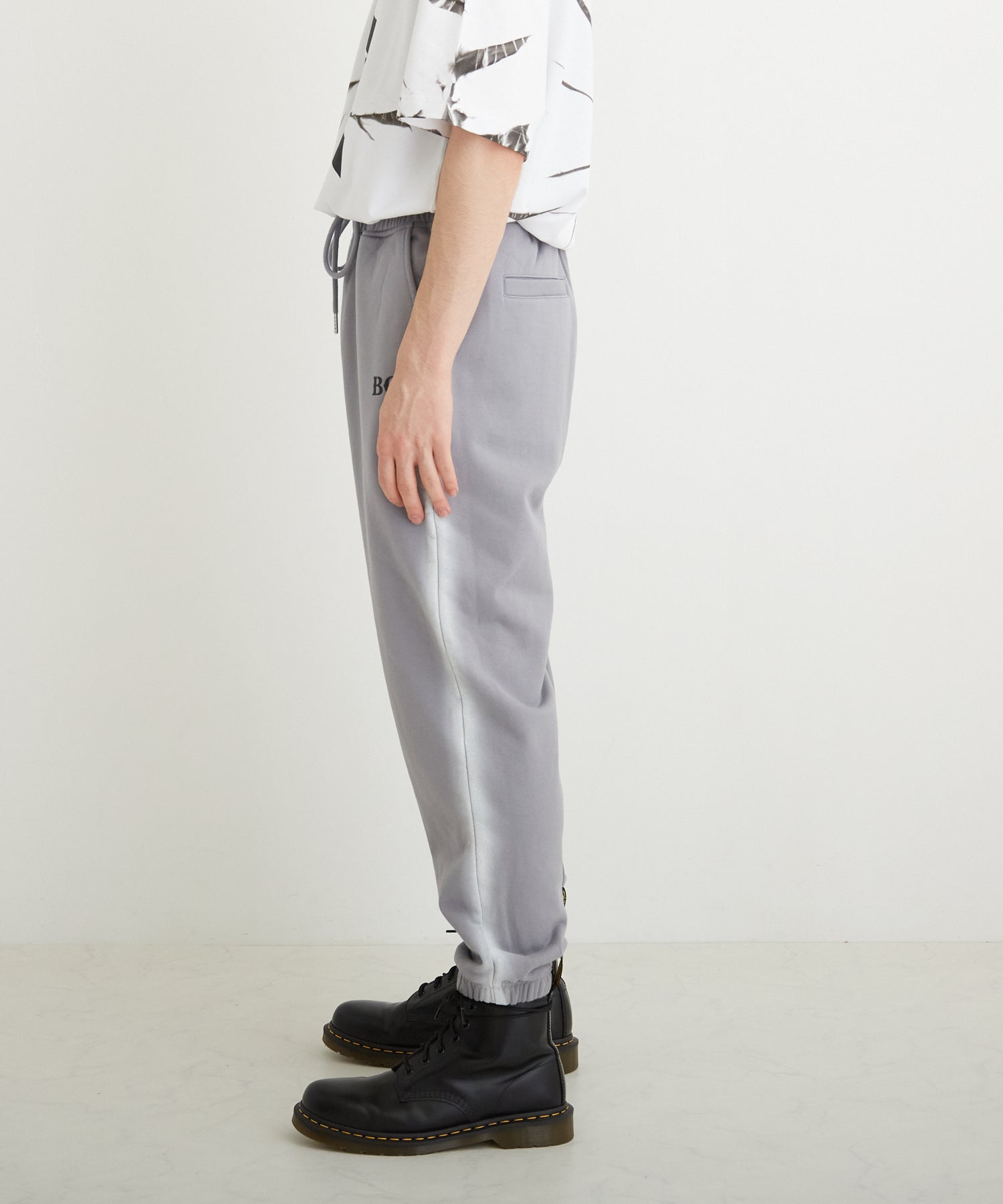 中肉の裏毛を使用したスウェットジョガーパンツです。フロントにはステンシル風のロゴを用い、サイドにはスプレー調のラインをあしらいました。