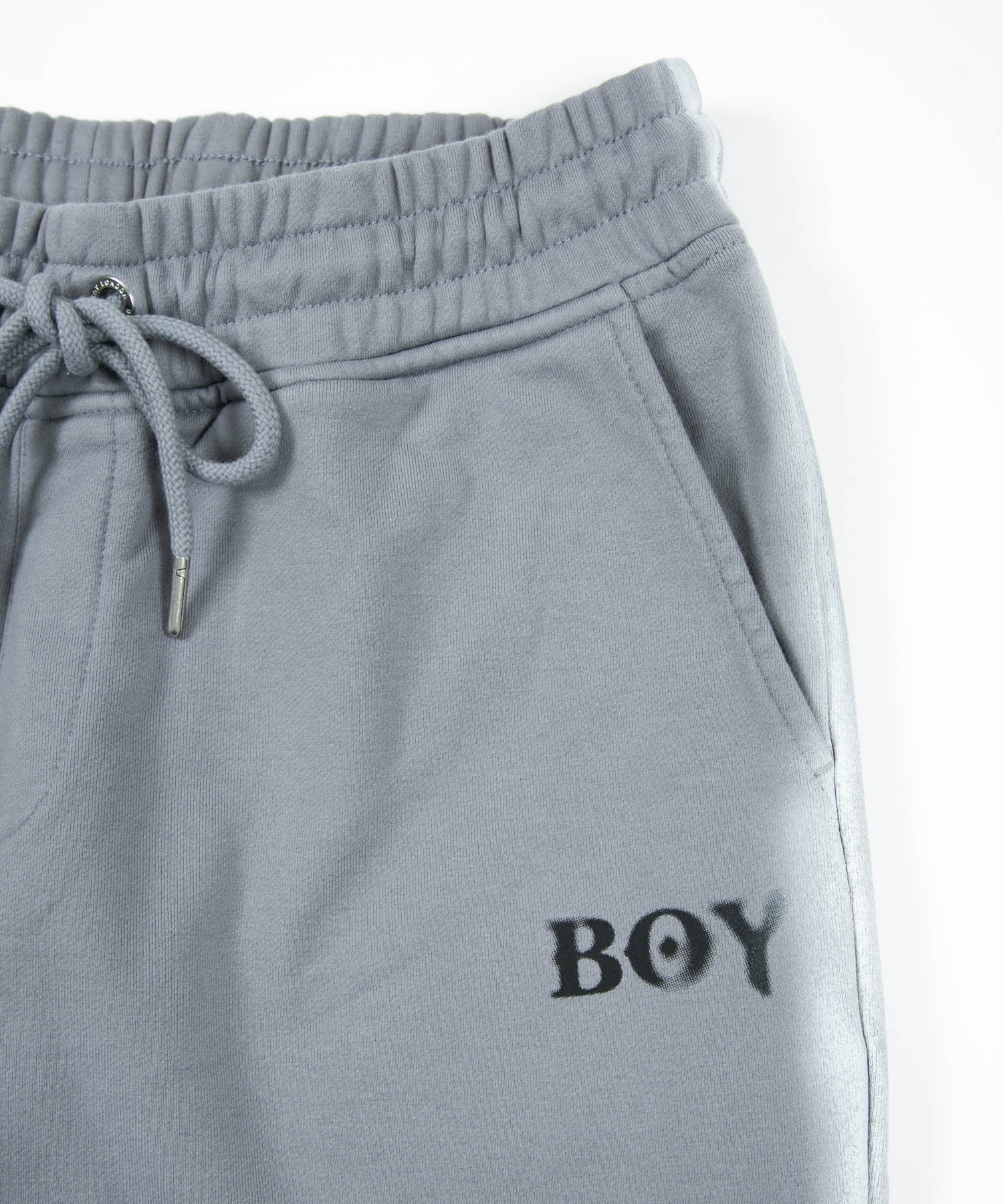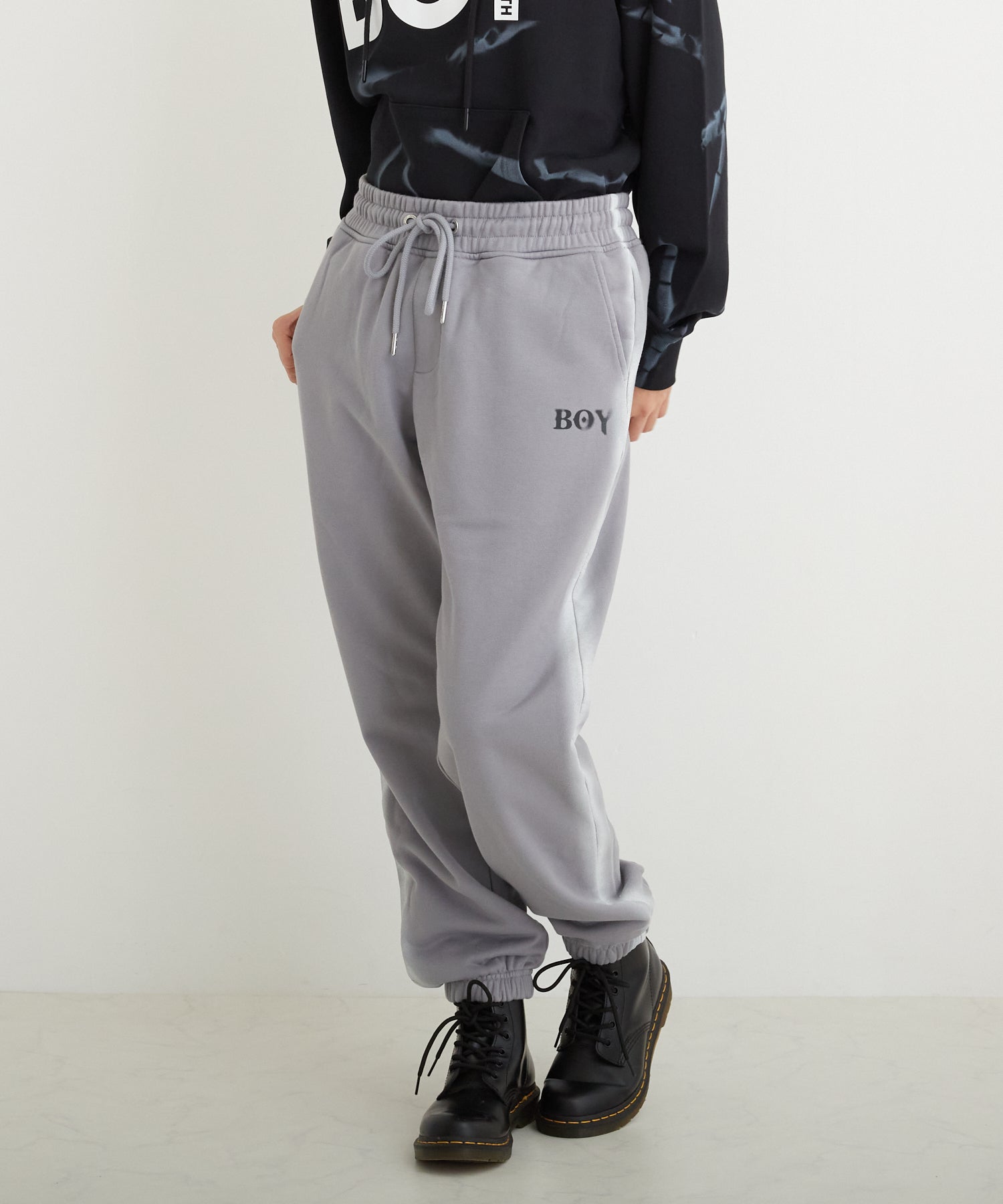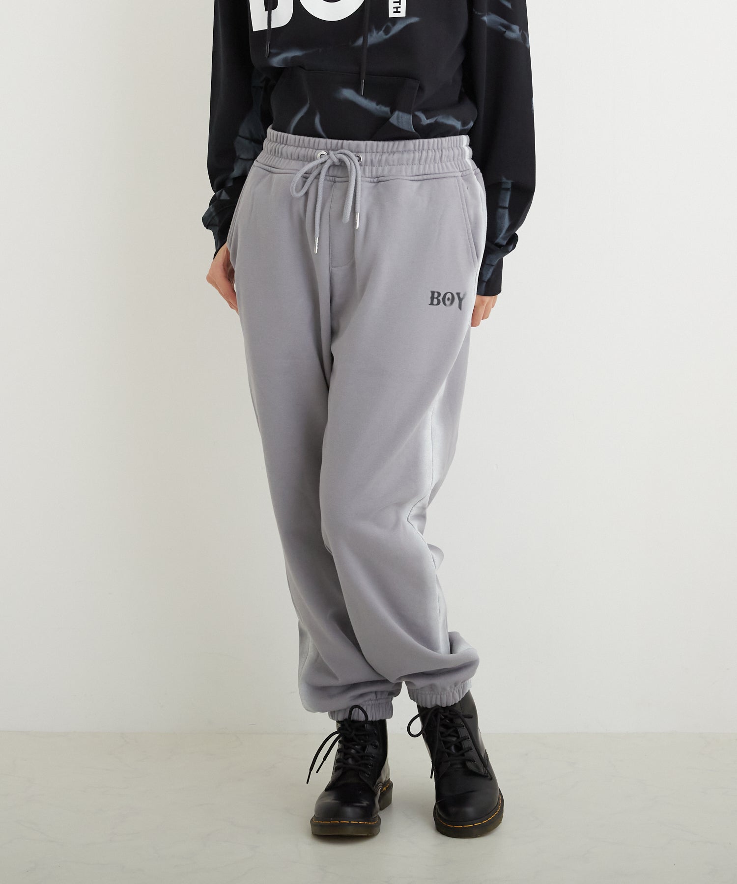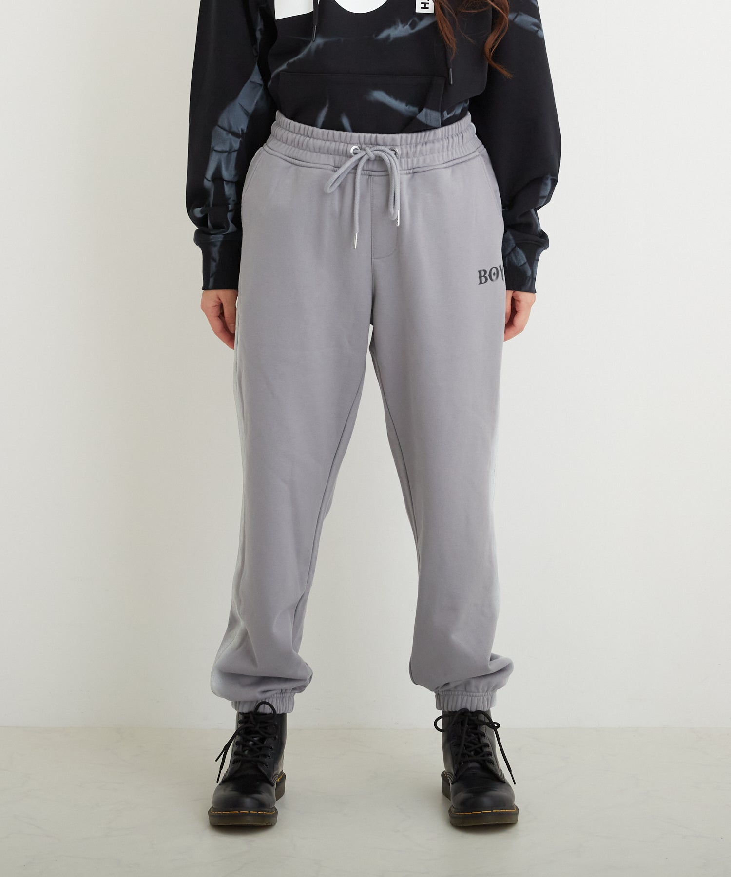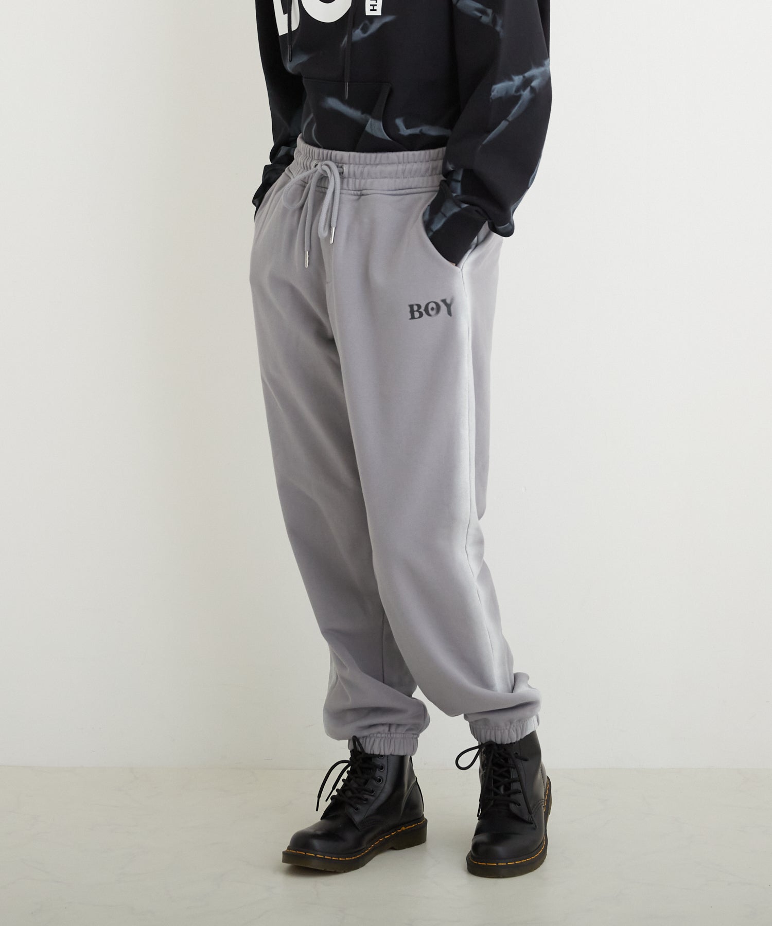 中肉の裏毛を使用したスウェットジョガーパンツです。フロントにはステンシル風のロゴを用い、サイドにはスプレー調のラインをあしらいました。