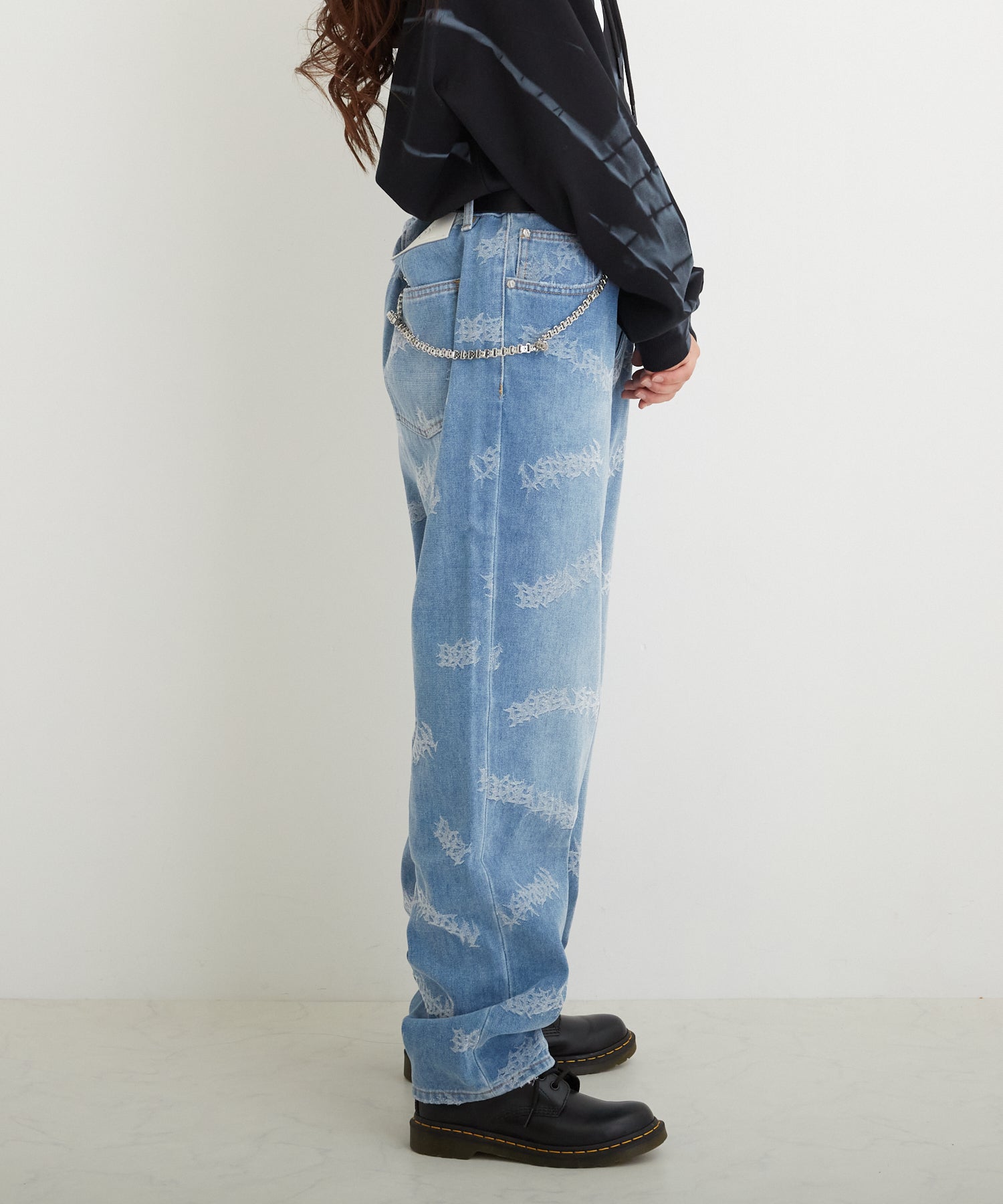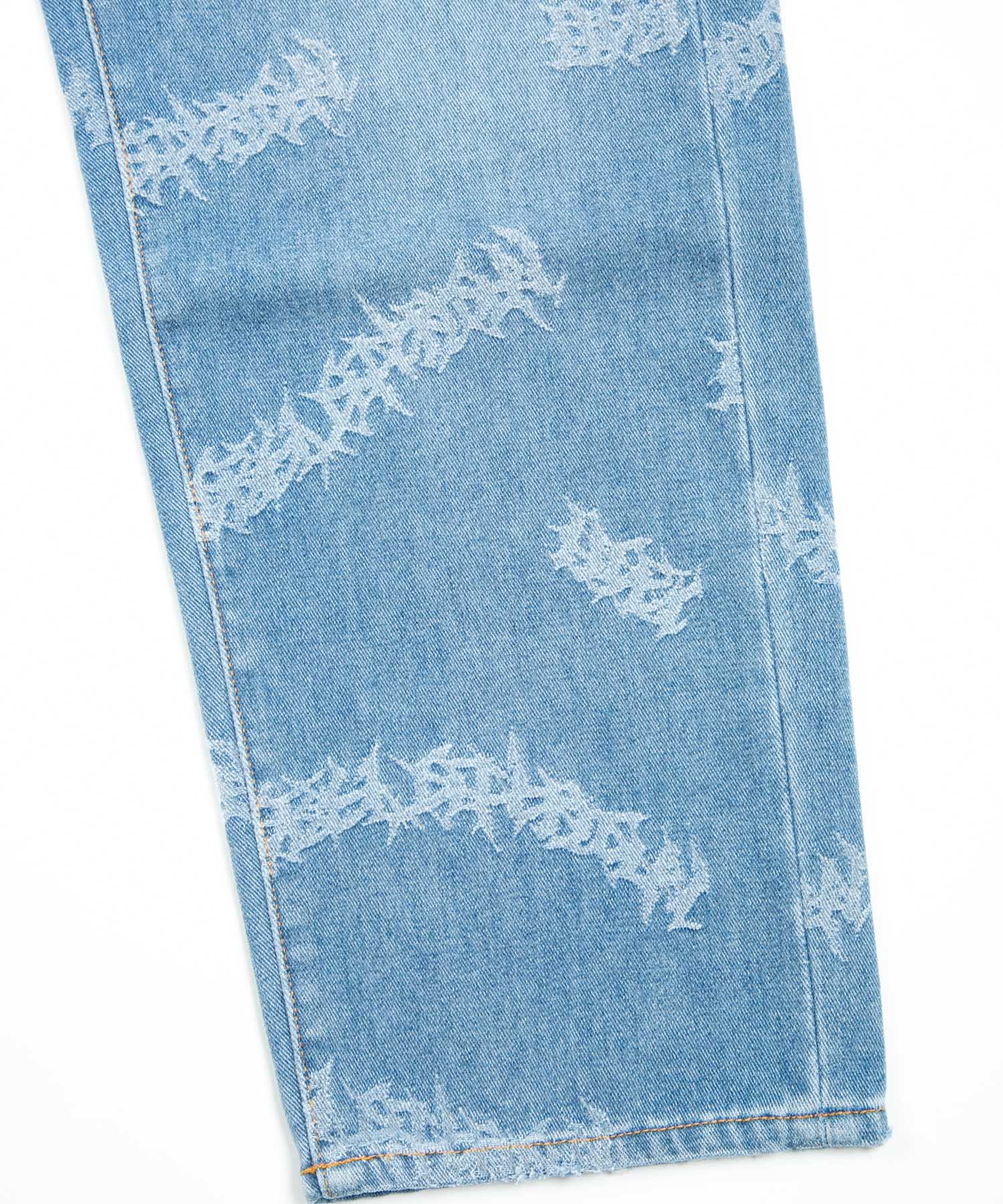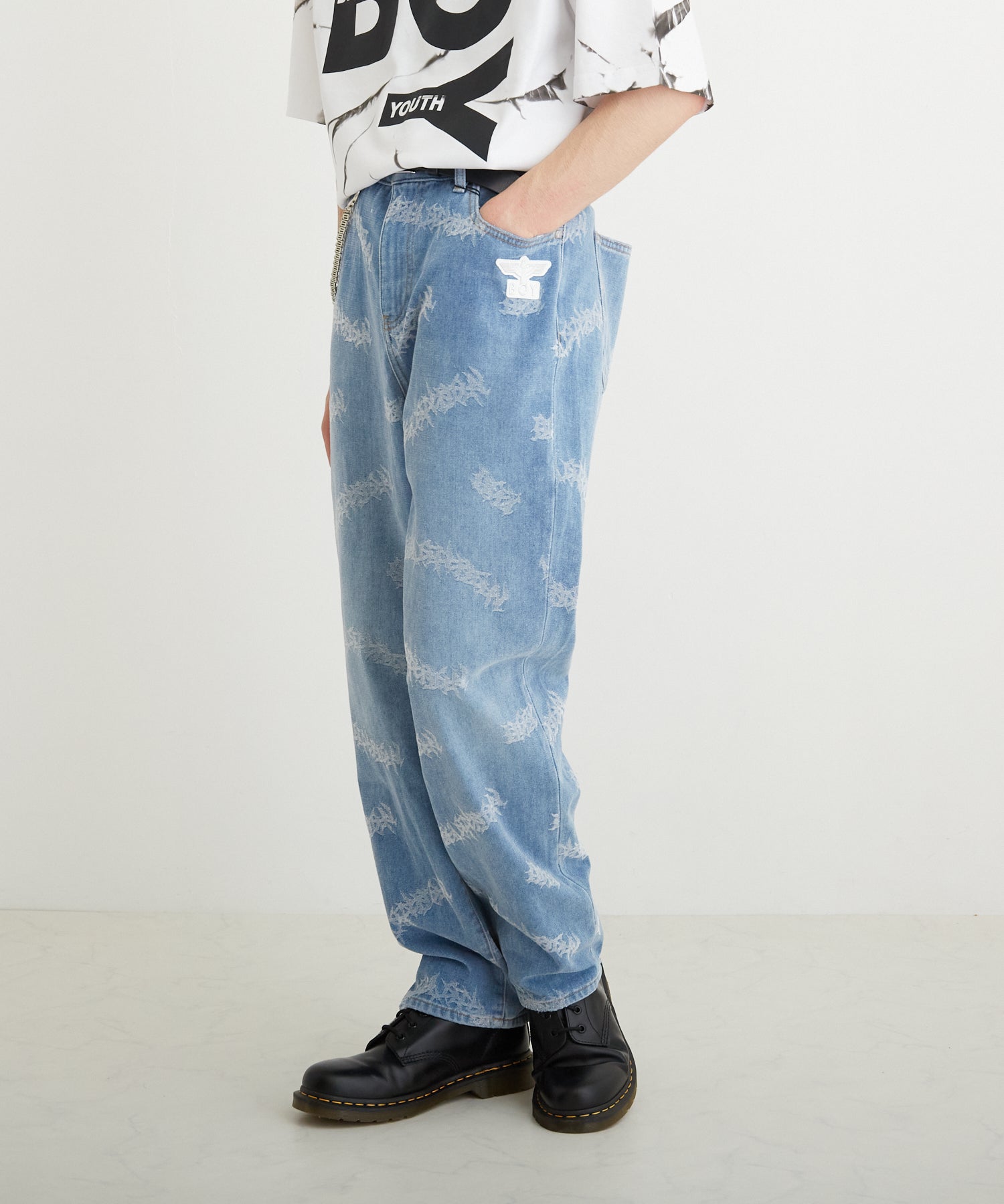 ヴィンテージ加工をほどこした柔らかい風合いのデニムパンツです。全面に特殊な加工でロゴを表現しています。