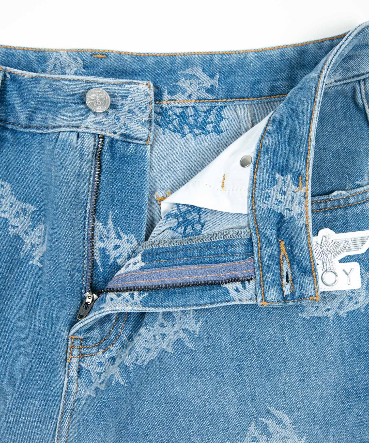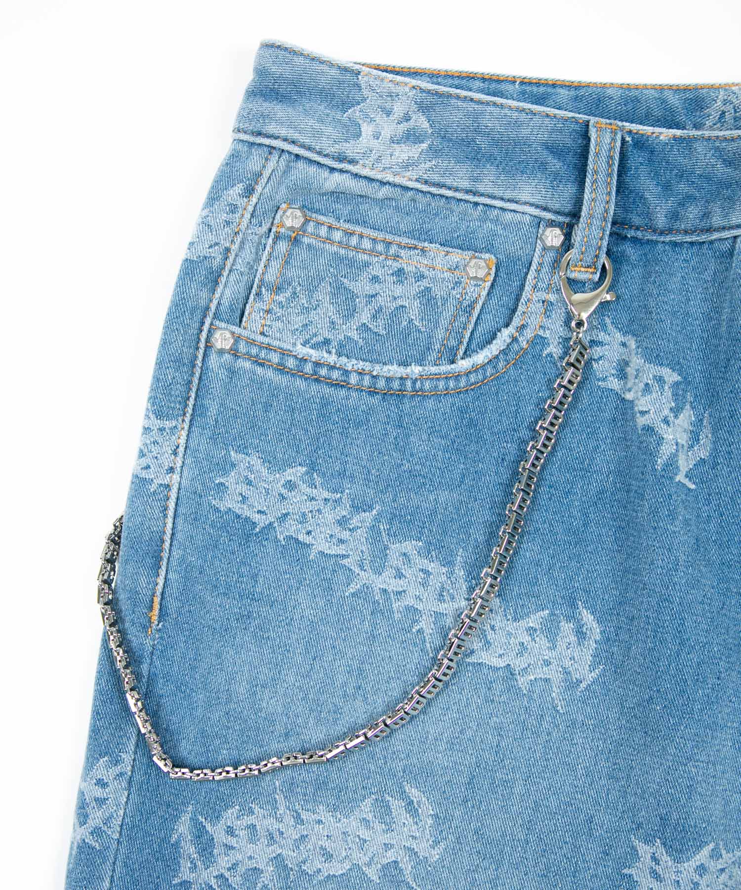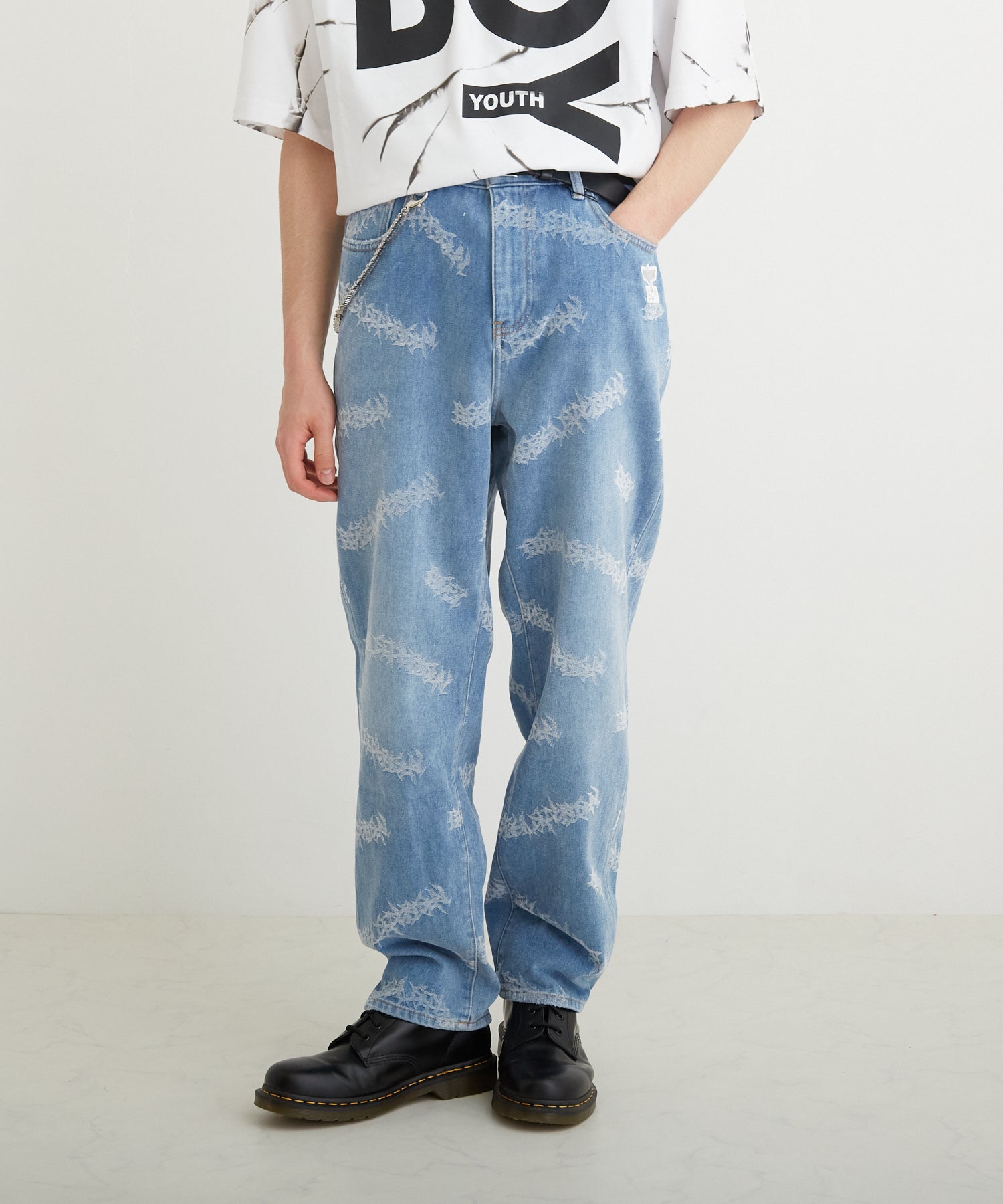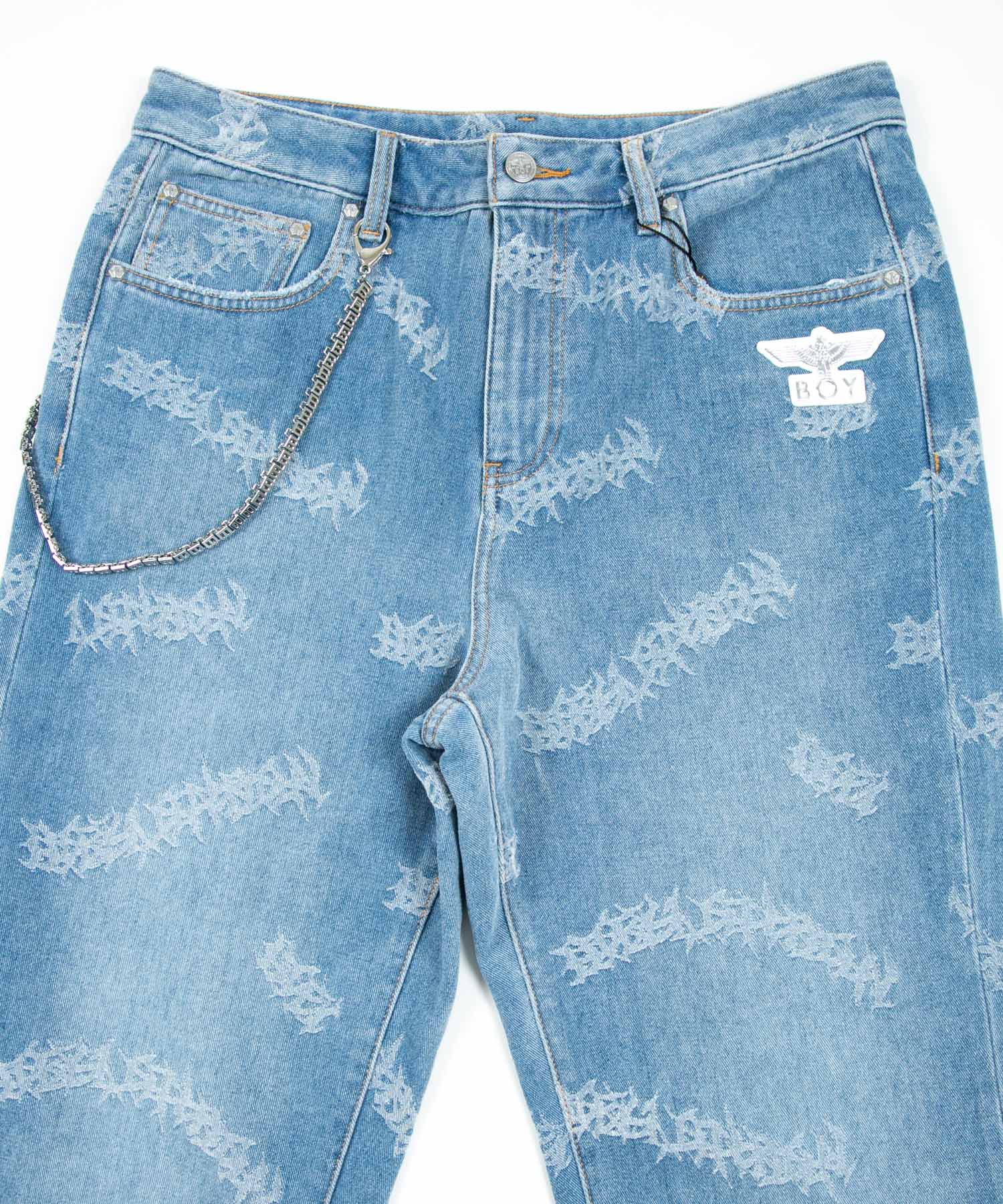 ヴィンテージ加工をほどこした柔らかい風合いのデニムパンツです。全面に特殊な加工でロゴを表現しています。
